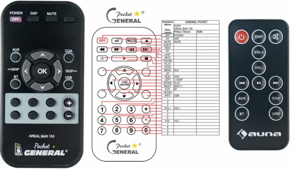 Dálkový ovladač AUNA Areal Bar 150 duplikát 1:1 originálního dálkového ovladače. Dálkový ovladač je určen pro tyto modely AUNA: AREAL BAR 150. (Nemusí zde být uvedeny úplně všechny kompatibilní modely. Pokud si nejste jisti, sdělte nám svůj model (použijte online chat, e-mail, telefon), neprodleně zkontrolujeme a ověříme, zda je tento ovladač kompatibilní s Vaším přístrojem. Za poskytnutou informaci ručíme.) Dálkový ovladač General POCKET duplikát má naprosto všechny funkce a popisky tlačítek stejné jako originální dálkový ovladač. Není třeba nic nastavovat, žádné kódy, funguje ihned po vložení baterií se všemi výše uvedenými modely. Ovladač je dodáván ve verzi značkového dálkového ovladače General POCKET duplikát (zobrazen vlevo) Jedná se o ovladač vyrobený pro specifické zařízení – NENÍ to univerzální ovladač! Má naprosto všechny funkce jako originální dálkový ovladač. Má stejné popisky tlačítek, jako jste byli zvyklí z originálu. Popisky tlačítek jsou velmi odolné a nejdou seškrábat ani hrubou silou. 2 roky záruka. General POCKET duplikát byl navržen a vyroben přesně podle originálního dálkového ovladače tlačítko po tlačítku. Ovladač je vyvinut a testován v České republice a podléhá CE a ROHS standardům. SNADNÉ INTUITIVNÍ POUŽÍVÁNÍ: Na rozdíl od běžných náhradních ovladačů, General POCKET duplikát má 100procent odpovídající popisky tlačítek jako na originálním ovladači. Srovnání: Jiné univerzální nebo programovatelné náhrady mají kvůli snížení nákladů názvy/popisky a rozložení tlačítek univerzální, popisky tlačítek často neodpovídají funkci tlačítka a vyžadují tedy návody k použití. To často vede k nejasnostem, co které tlačítko dělá a stálá potřeba manuálu je velmi obtěžující. S ovladačem General POCKET duplikát žádný návod nepotřebujete, tlačítko dělá přesně to, co symbolizuje jeho popisek. GARANTUJEME 100procent FUNKČNOST: Narozdíl od jiných náhrad je každý dálkový ovladač General POCKET duplikát přímo v naší firmě navržen a testován na míru pro konkrétní zařízení tak, aby každé tlačítko odpovídalo funkci tlačítka originálního ovladače. Díky tomu můžeme zaručit 100procent funkčnost přesně jako originální ovladač. Samotné šasi bylo navrženo a vyvíjeno tak, aby bylo co nejodolnější a nejspolehlivější. Zároveň však byl kladen důraz na přívětivé rozložení tlačítek a popisky tlačítek jsou optimalizovány pro dobrou viditelnost. Materiály a součástky byly podrobeny důkladným testům, aby odolaly i tomu nejtvrdšímu zacházení a poskytovaly tak dlouhodobou životnost. Názvy tlačítek jsou na ovladači natištěny moderní technologií v naší firmě (naše vlastní know-how). Tisk je extrémně odolný a nelze jej setřít ani oškrábat. DUPLIKÁT originálního dálkového ovladače má naprosto stejné funkce a stejné názvy tlačítek jako Váš původní originální ovladač. Nemusíte nic nastavovat, po vložení baterií bude okamžitě fungovat, ovladač je již nakonfigurován tak, aby fungoval na modely uvedené výše. Nápisy na tlačítkách přesně odpovídají funkcím tlačítek, tiskneme je přesně podle originálního ovladače. Narozdíl od všech univerzálních a programovatelných náhrad, kde jsou názvy tlačítek univerzální a pro uživatele matoucí. Popisky jsou natištěny technicky vyspělou technologií v naší provozovně (naše know-how), jsou extrémně odolné, nejdou setřít ani seškrábat (např. nehtem). Opravdu jsme schopni vyrobit jakýkoliv dálkový ovladač! Splníme i požadavky na exotické ovladače, které nejsou (zatím) v naší nabídce. DUPLIKÁT = Nejlepší poměr cena/výkon. DOPORUČUJEME! DUPLIKÁT originálního dálkového ovladače má naprosto stejné funkce a stejné názvy tlačítek jako Váš původní originální ovladač. Nemusíte nic nastavovat, po vložení baterií bude okamžitě fungovat, ovladač je již nakonfigurován tak, aby fungoval na modely uvedené níže. Nápisy na tlacitkach přesně odpovídají funkcím tlačítek, tiskneme je přesně podle oriignálního ovladače. Narozdil od všech univerzalnich a programovatelnych náhrad, kde jsou názvy tlačítek univerzální a pro uživatele matoucí. Popisky jsou natištěny technicky vyspělou technologií v naší provozovně (naše know-how), jsou extrémně odolné, nejdou setřít ani seškrábat (např.nehtem). Opravdu jsme schopni vyrobit jakýkoliv dálkový ovladač! Splníme i požadavky na exotické ovladače, které nejsou (zatím :) v naší nabídce. DUPLIKÁT = Nejlepší poměr cena/výkon. DOPORUČUJEME!