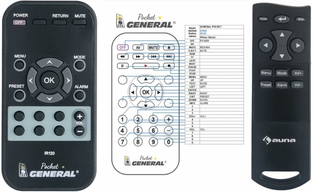 Dálkový ovladač AUNA IR-120 (IR120) duplikát 1:1 originálního dálkového ovladače. Dálkový ovladač je určen pro tyto modely AUNA: IR-120, IR120. (Nemusí zde být uvedeny úplně všechny kompatibilní modely. Pokud si nejste jisti, sdělte nám svůj model (použijte online chat, e-mail, telefon), neprodleně zkontrolujeme a ověříme, zda je tento ovladač kompatibilní s Vaším přístrojem. Za poskytnutou informaci ručíme.) Dálkový ovladač General POCKET duplikát má naprosto všechny funkce a popisky tlačítek stejné jako originální dálkový ovladač. Není třeba nic nastavovat, žádné kódy, funguje ihned po vložení baterií se všemi výše uvedenými modely. Ovladač je dodáván ve verzi značkového dálkového ovladače General POCKET duplikát (zobrazen vlevo) Jedná se o ovladač vyrobený pro specifické zařízení – NENÍ to univerzální ovladač! Má naprosto všechny funkce jako originální dálkový ovladač. Má stejné popisky tlačítek, jako jste byli zvyklí z originálu. Popisky tlačítek jsou velmi odolné a nejdou seškrábat ani hrubou silou. 2 roky záruka. General POCKET duplikát byl navržen a vyroben přesně podle originálního dálkového ovladače tlačítko po tlačítku. Ovladač je vyvinut a testován v České republice a podléhá CE a ROHS standardům. SNADNÉ INTUITIVNÍ POUŽÍVÁNÍ: Na rozdíl od běžných náhradních ovladačů, General POCKET duplikát má 100procent odpovídající popisky tlačítek jako na originálním ovladači. Srovnání: Jiné univerzální nebo programovatelné náhrady mají kvůli snížení nákladů názvy/popisky a rozložení tlačítek univerzální, popisky tlačítek často neodpovídají funkci tlačítka a vyžadují tedy návody k použití. To často vede k nejasnostem, co které tlačítko dělá a stálá potřeba manuálu je velmi obtěžující. S ovladačem General POCKET duplikát žádný návod nepotřebujete, tlačítko dělá přesně to, co symbolizuje jeho popisek. GARANTUJEME 100procent FUNKČNOST: Narozdíl od jiných náhrad je každý dálkový ovladač General POCKET duplikát přímo v naší firmě navržen a testován na míru pro konkrétní zařízení tak, aby každé tlačítko odpovídalo funkci tlačítka originálního ovladače. Díky tomu můžeme zaručit 100procent funkčnost přesně jako originální ovladač. Samotné šasi bylo navrženo a vyvíjeno tak, aby bylo co nejodolnější a nejspolehlivější. Zároveň však byl kladen důraz na přívětivé rozložení tlačítek a popisky tlačítek jsou optimalizovány pro dobrou viditelnost. Materiály a součástky byly podrobeny důkladným testům, aby odolaly i tomu nejtvrdšímu zacházení a poskytovaly tak dlouhodobou životnost. Názvy tlačítek jsou na ovladači natištěny moderní technologií v naší firmě (naše vlastní know-how). Tisk je extrémně odolný a nelze jej setřít ani oškrábat. DUPLIKÁT originálního dálkového ovladače má naprosto stejné funkce a stejné názvy tlačítek jako Váš původní originální ovladač. Nemusíte nic nastavovat, po vložení baterií bude okamžitě fungovat, ovladač je již nakonfigurován tak, aby fungoval na modely uvedené výše. Nápisy na tlačítkách přesně odpovídají funkcím tlačítek, tiskneme je přesně podle originálního ovladače. Narozdíl od všech univerzálních a programovatelných náhrad, kde jsou názvy tlačítek univerzální a pro uživatele matoucí. Popisky jsou natištěny technicky vyspělou technologií v naší provozovně (naše know-how), jsou extrémně odolné, nejdou setřít ani seškrábat (např. nehtem). Opravdu jsme schopni vyrobit jakýkoliv dálkový ovladač! Splníme i požadavky na exotické ovladače, které nejsou (zatím) v naší nabídce. DUPLIKÁT = Nejlepší poměr cena/výkon. DOPORUČUJEME! DUPLIKÁT originálního dálkového ovladače má naprosto stejné funkce a stejné názvy tlačítek jako Váš původní originální ovladač. Nemusíte nic nastavovat, po vložení baterií bude okamžitě fungovat, ovladač je již nakonfigurován tak, aby fungoval na modely uvedené níže. Nápisy na tlacitkach přesně odpovídají funkcím tlačítek, tiskneme je přesně podle oriignálního ovladače. Narozdil od všech univerzalnich a programovatelnych náhrad, kde jsou názvy tlačítek univerzální a pro uživatele matoucí. Popisky jsou natištěny technicky vyspělou technologií v naší provozovně (naše know-how), jsou extrémně odolné, nejdou setřít ani seškrábat (např.nehtem). Opravdu jsme schopni vyrobit jakýkoliv dálkový ovladač! Splníme i požadavky na exotické ovladače, které nejsou (zatím :) v naší nabídce. DUPLIKÁT = Nejlepší poměr cena/výkon. DOPORUČUJEME!