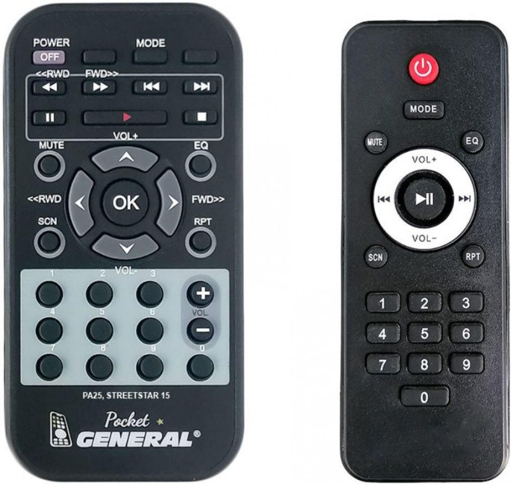 Dálkový ovladač AUNA Streetstar 15 duplikát 1:1 originálního dálkového ovladače. Dokonalá 1:1 kopie navržená a vyrobená naší firmou – má všechny funkce originálního ovladače pro tyto modely značky AUNA:10031567 STREETSTAR 12, STREETSTAR 8 . (Nemusí zde být uvedeny úplně všechny kompatibilní modely. Pokud si nejste jisti, sdělte nám svůj model (použijte online chat, e-mail, telefon), neprodleně zkontrolujeme a ověříme, zda je tento ovladač kompatibilní s Vaším přístrojem. Za poskytnutou informaci ručíme.) Dálkový ovladač General POCKET duplikát má naprosto všechny funkce a popisky tlačítek stejné jako originální dálkový ovladač. Není třeba nic nastavovat, žádné kódy, funguje ihned po vložení baterií se všemi výše uvedenými modely.Ovladač je dodáván ve verzi značkového dálkového ovladače General POCKET duplikát (zobrazen vlevo)Jedná se o ovladač vyrobený pro specifické zařízení – NENÍ to univerzální ovladač!Má naprosto všechny funkce jako originální dálkový ovladač.Má stejné popisky tlačítek, jako jste byli zvyklí z originálu.Popisky tlačítek jsou velmi odolné a nejdou seškrábat ani hrubou silou.3 roky záruka.Nulová poruchovost tohoto modelu! Nemáme zádné reklamace a přitom je to náš nejprodávanější ovladač.General POCKET duplikát byl tlačítko po tlačítku navržen a vyroben přesně podle originálního dálkového ovladače na obrázku vpravo. Výroben v naší firmě v Ostravě, vývoj, výroba i atesty v České republice - splňuje CE a ROHS standardy.SNADNÉ INTUITIVNÍ POUŽÍVÁNÍ: Na rozdíl od běžných náhradních ovladačů, General POCKET duplikát má 100% stejné popisky tlačítek jako Váš původní originální dálkový ovladač.Srovnání: Ostatní univerzální nebo programovatelné náhrady mají (kvůli úspoře nákladů) univerzální rozložení s nesprávně označenými tlačítky, a proto potřebují návod (tabulku funkcí), který říká, jaká je skutečná funkce jednotlivých tlačítek. To může způsobovat zmatek a nutnost neustálého vracení se k návodu je pro koncového uživatele obtěžující. Naopak při používání našeho dálkového ovladače G..