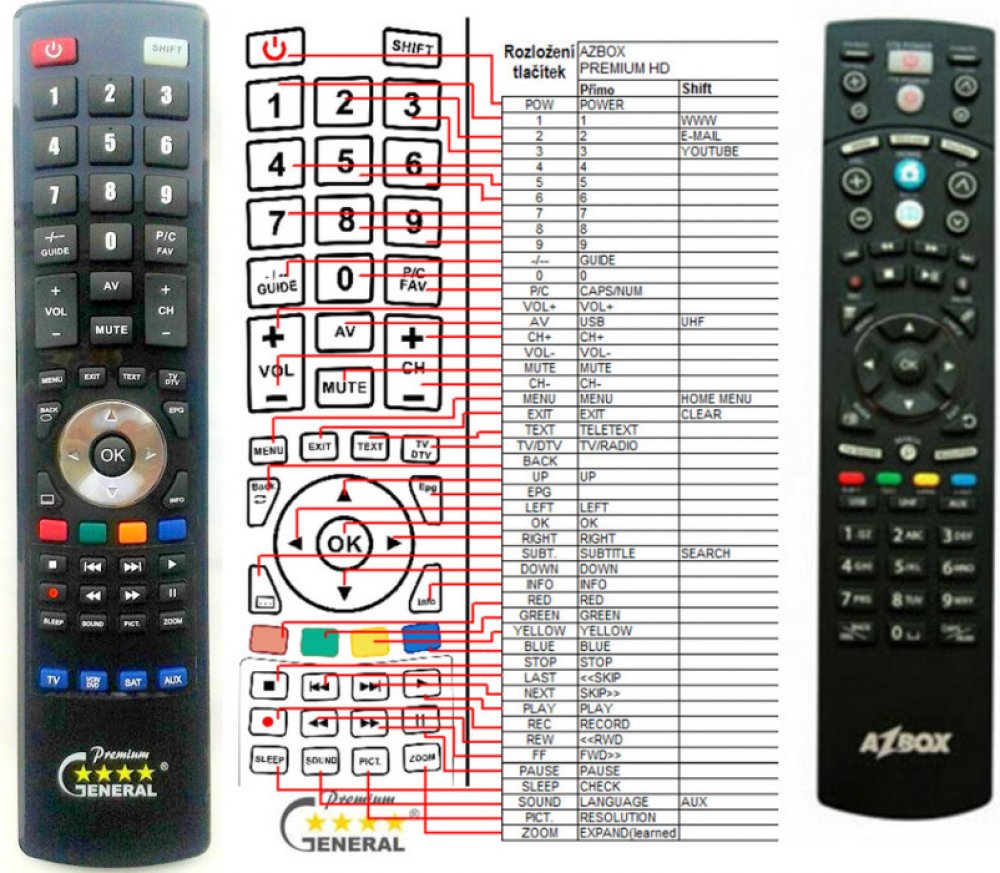 Náhradní dálkový ovladač AZBOX PREMIUM HD - 100procent náhrada 1:1 za originální dálkový ovladač. Dálkový ovladač je určen pro tyto modely AZBOX: PREMIUM, PREMIUM PLUS. (Nemusí zde být uvedeny úplně všechny kompatibilní modely. Pokud si nejste jisti, sdělte nám svůj model (použijte online chat, e-mail, telefon), neprodleně zkontrolujeme a ověříme, zda je tento ovladač kompatibilní s Vaším přístrojem. Za poskytnutou informaci ručíme.) Ovladač je dodáván ve verzi značkového dálkového ovladače General Premium (zobrazen vlevo). Garantujeme Vám, že dostanete ovladač, který plně nahradí Váš původní originální ovladač a bude mít naprosto všechny funkce. Není to univerzální ovladač, ale ovladač, který je naprogramován a přímo určen pro modely přístrojů uvedené výše. Není třeba žádné párování, žádné kódy. Obdržíte od nás ovladač, který je připraven k použití - jediné, co musíte udělat, je vložit baterie a ovladač hned funguje. Podívejte se na obrázek ovladače a ujistěte se, že jsou v tabulce všechny funkce jako na původním originálním ovladači. Jedná se o plnohodnotný náhradní dálkový ovladač (není to „univerzál“). Má naprosto všechny funkce přesně jako originální ovladač. Záruční lhůta na ovladač je 2 roky. Dodáván také jednoduchý návod s mapováním funkcí. DOPLŇKOVÁ FUNKCE: Tento dálkový ovladač je možno naprogramovat na 1-4 zařízení (celkem tedy 4). Budete moci jedním ovladačem ovládat několik různých přístrojů jedním ovladačem. Pokud nám do komentáře v objednávce napíšete modely dalších přístrojů, naprogramujeme Vám ovladač na všechny. Za tuto doplňkovou službu bude naúčtován příplatek k ceně ovladače 50 Kč: více informací V případě, že v budoucnu vyměníte/obměníte Vaši domácí elektroniku, jsme schopni Vám tento ovladač přeprogramovat na naprosto jakékoliv nové/á zařízení. Ovladač General přežije Váš stávající přístroj!