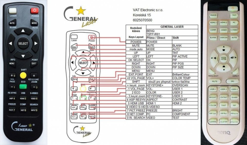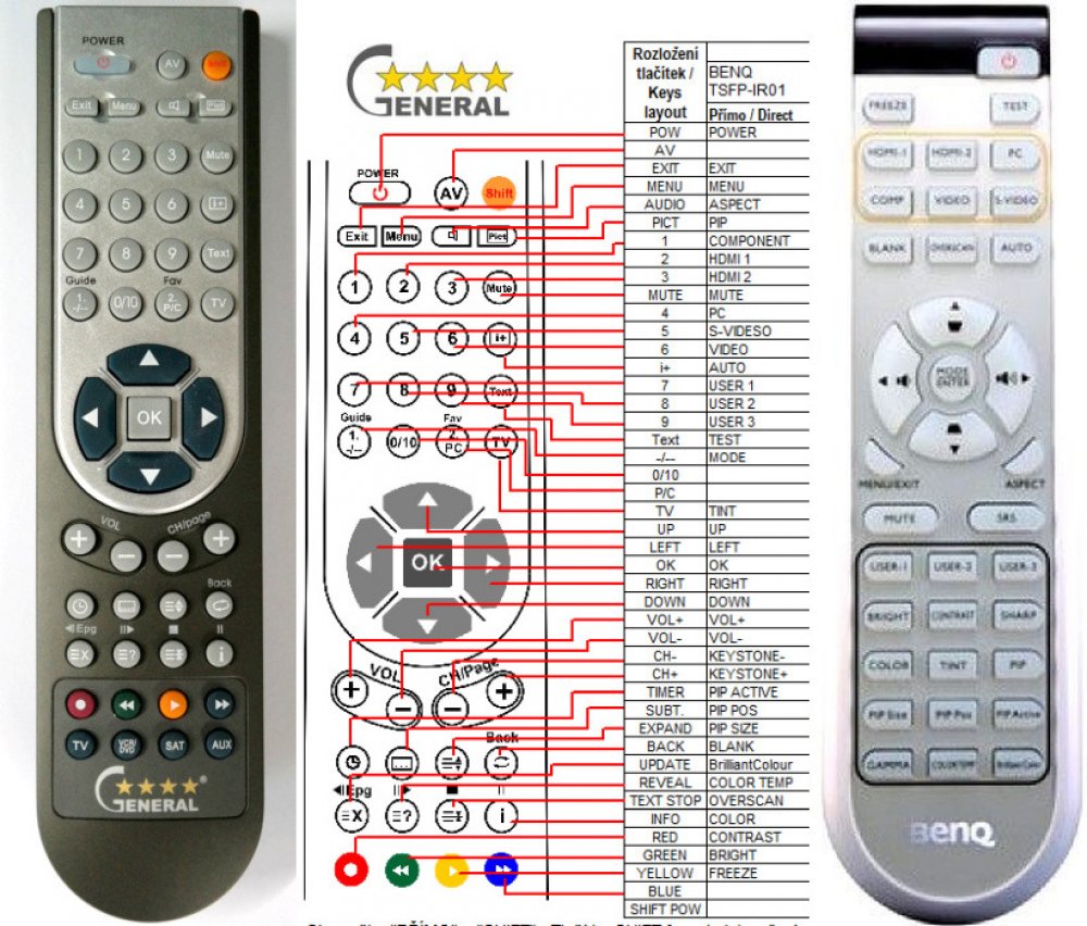 Náhradní dálkový ovladač BENQ TSFP-IR01, W1100, W1200 (TSFPIR01, W1100, W1200) - 100% náhrada 1:1 za originální dálkový ovladač. Dálkový ovladač byl vyvinut speciálně na míru pro tyto modely značky BENQ:TSFP-IR01, W1100, W1200. (Nemusí zde být uvedeny úplně všechny kompatibilní modely. Pokud si nejste jisti, sdělte nám svůj model (použijte online chat, e-mail, telefon), neprodleně zkontrolujeme a ověříme, zda je tento ovladač kompatibilní s Vaším přístrojem. Za poskytnutou informaci ručíme.) Ovladač je dodáván ve verzi značkového dálkového ovladače General LASER (zobrazen vlevo). Garantujeme Vám, že dostanete ovladač, který plně nahradí Váš původní originální ovladač a bude mít naprosto všechny funkce stejné.Není to univerzální ovladač, ale ovladač, který je naprogramován a přímo určen pro modely projektorů uvedené výše. Není třeba žádné párování, žádné kódy. Obdržíte od nás ovladač, který je připraven k použití - jediné, co musíte udělat, je vložit baterie a ovladač hned funguje. Jedná se o plnohodnotný náhradní dálkový ovladač speciálně navržen pro projektory (není to „univerzál“). Má naprosto všechny funkce přesně jako originální ovladač. Ovladač má přidanou funkci LASEROVÉ UKAZOVÁTKO. Dodáván také jednoduchý návod s mapováním funkcí.V případě, že v budoucnu vyměníte Váš projektor za jinou značku/model, jsme schopni Vám tento ovladač přeprogramovat na naprosto jakékoliv nové/á zařízení. Ovladač General LASER přežije Váš stávající přístroj!
