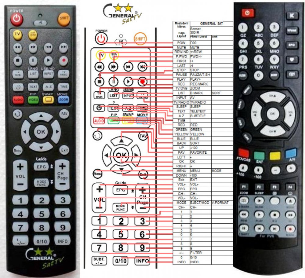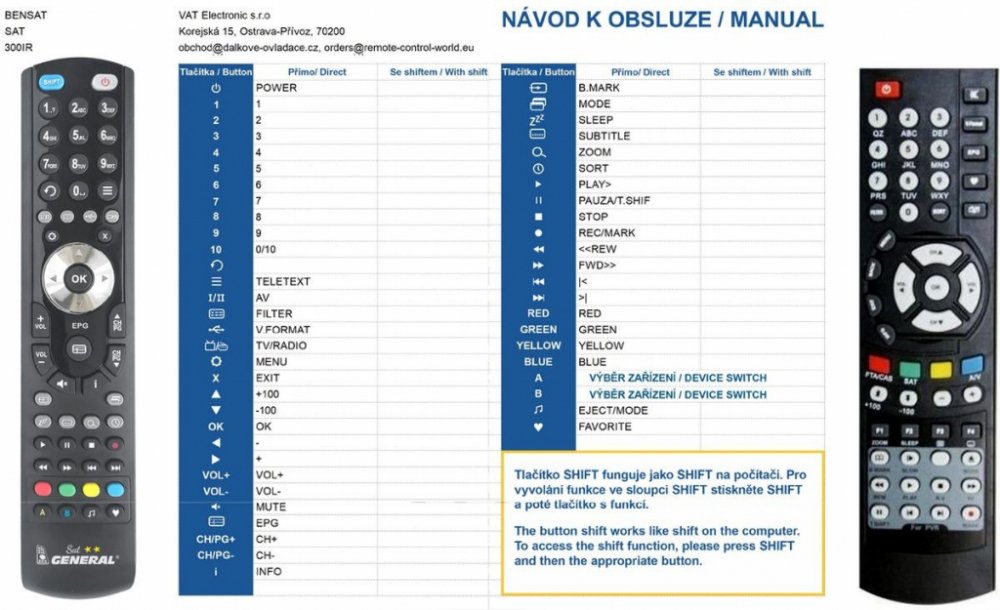 Náhradní dálkový ovladač BENSAT 300IR PVR - 100% náhrada 1:1 za originální dálkový ovladač. Dálkový ovladač byl vyvinut speciálně na míru pro tyto modely značky BENSAT:300IR PVR. (Nemusí zde být uvedeny úplně všechny kompatibilní modely. Pokud si nejste jisti, sdělte nám svůj model (použijte online chat, e-mail, telefon), neprodleně zkontrolujeme a ověříme, zda je tento ovladač kompatibilní s Vaším přístrojem. Za poskytnutou informaci ručíme.) Ovladač je dodáván ve verzi značkového dálkového ovladače General SAT/TV (zobrazen vlevo). Garantujeme Vám, že dostanete ovladač, který plně nahradí Váš původní originální ovladač a bude mít naprosto všechny funkce stejné.Není to univerzální ovladač, ale ovladač, který je naprogramován a přímo určen pro modely přístrojů uvedené výše. Není třeba žádné párování, žádné kódy. Obdržíte od nás ovladač, který je připraven k použití - jediné, co musíte udělat, je vložit baterie a ovladač hned funguje. Podívejte se na obrázek ovladače a ujistěte se, že jsou v tabulce všechny funkce jako na původním originálním ovladači. Jedná se o plnohodnotný náhradní dálkový ovladač (není to „univerzál“). Má naprosto všechny funkce přesně jako originální ovladač. Záruční lhůta na ovladač je 3 roky. Dodáván také jednoduchý návod s mapováním funkcí. DOPLŇKOVÁ FUNKCE: Tento dálkový ovladač je možno naprogramovat na 1 další přístroj. Budete moci jedním ovladačem ovládat oba přístroje (např. SAT+TV nebo SAT+DVD apod). Pokud nám do komentáře v objednávce napíšete model dalšího přístroje, naprogramujeme Vám ovladač na oba. Za tuto doplňkovou službu bude naúčtován příplatek k ceně ovladače 50 Kč: více informací