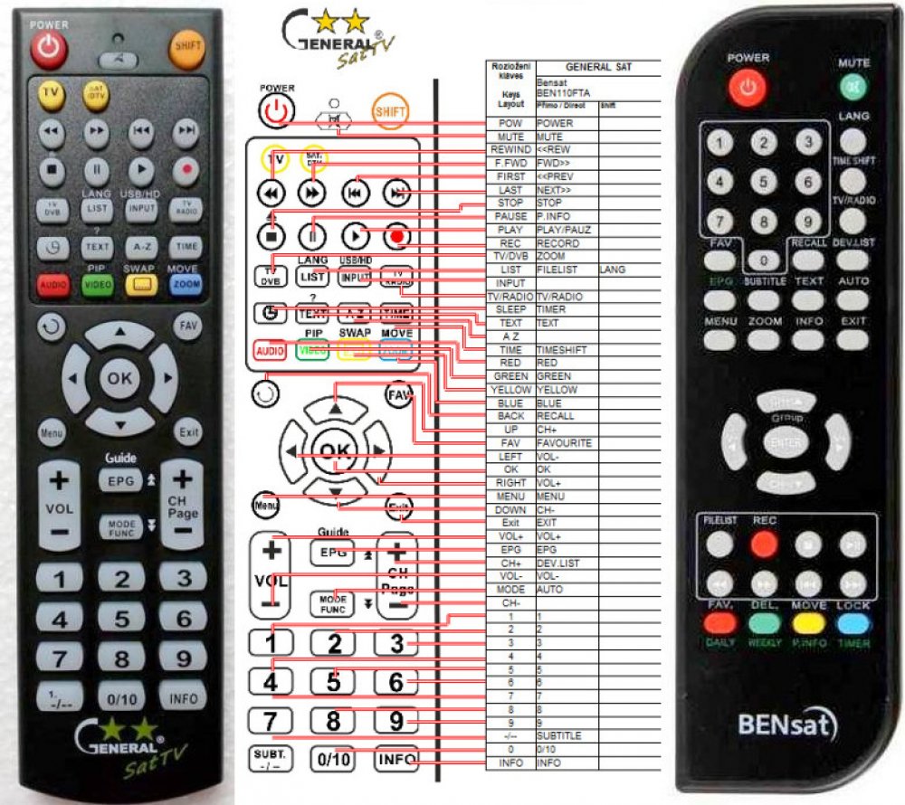 Ovladač je dodáván ve verzi NEUNIVERZÁLNÍHO ovladače General SAT-TV (zobrazen vlevo!). Bude nastaven pro Váš přístroj a stačí tedy vložit 2 ks AAA baterií.