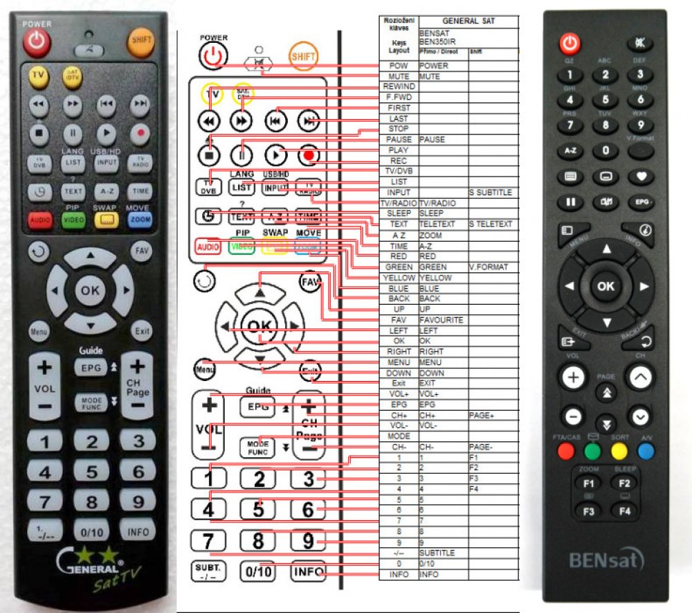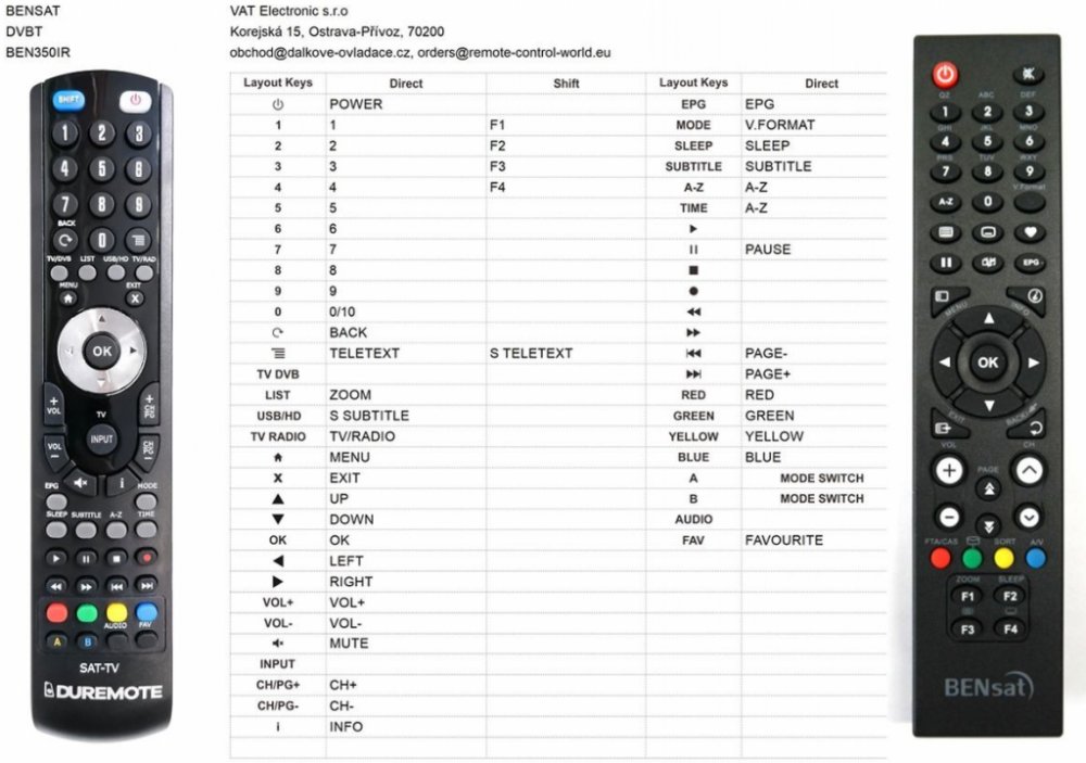 Náhradní dálkový ovladač BENSAT BEN350IR - 100% náhrada 1:1 za originální dálkový ovladač. Dálkový ovladač byl vyvinut speciálně na míru pro tyto modely značky BENSAT:BEN350IR. (Nemusí zde být uvedeny úplně všechny kompatibilní modely. Pokud si nejste jisti, sdělte nám svůj model (použijte online chat, e-mail, telefon), neprodleně zkontrolujeme a ověříme, zda je tento ovladač kompatibilní s Vaším přístrojem. Za poskytnutou informaci ručíme.) Ovladač je dodáván ve verzi značkového dálkového ovladače General Duremote (zobrazen vlevo). Garantujeme Vám, že dostanete ovladač, který plně nahradí Váš původní originální ovladač a bude mít naprosto všechny funkce stejné.Není to univerzální ovladač, ale ovladač, který je naprogramován a přímo určen pro modely přístrojů uvedené výše. Není třeba žádné párování, žádné kódy. Obdržíte od nás ovladač, který je připraven k použití - jediné, co musíte udělat, je vložit baterie a ovladač hned funguje. Podívejte se na obrázek ovladače a ujistěte se, že jsou v tabulce všechny funkce jako na původním originálním ovladači. Jedná se o plnohodnotný náhradní dálkový ovladač (není to „univerzál“). Má naprosto všechny funkce přesně jako originální ovladač. Záruční lhůta na ovladač je 3 roky. Dodáván také jednoduchý návod s mapováním funkcí. DOPLŇKOVÁ FUNKCE: Tento dálkový ovladač je možno naprogramovat na 1 další přístroj. Budete moci jedním ovladačem ovládat oba přístroje. Pokud nám do komentáře v objednávce napíšete model dalšího přístroje, naprogramujeme Vám ovladač na oba. Za tuto doplňkovou službu bude naúčtován příplatek k ceně ovladače 50 Kč: více informací