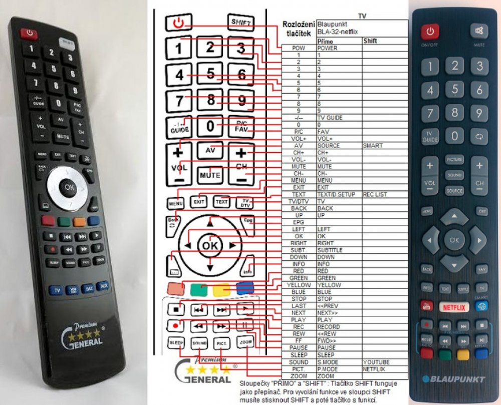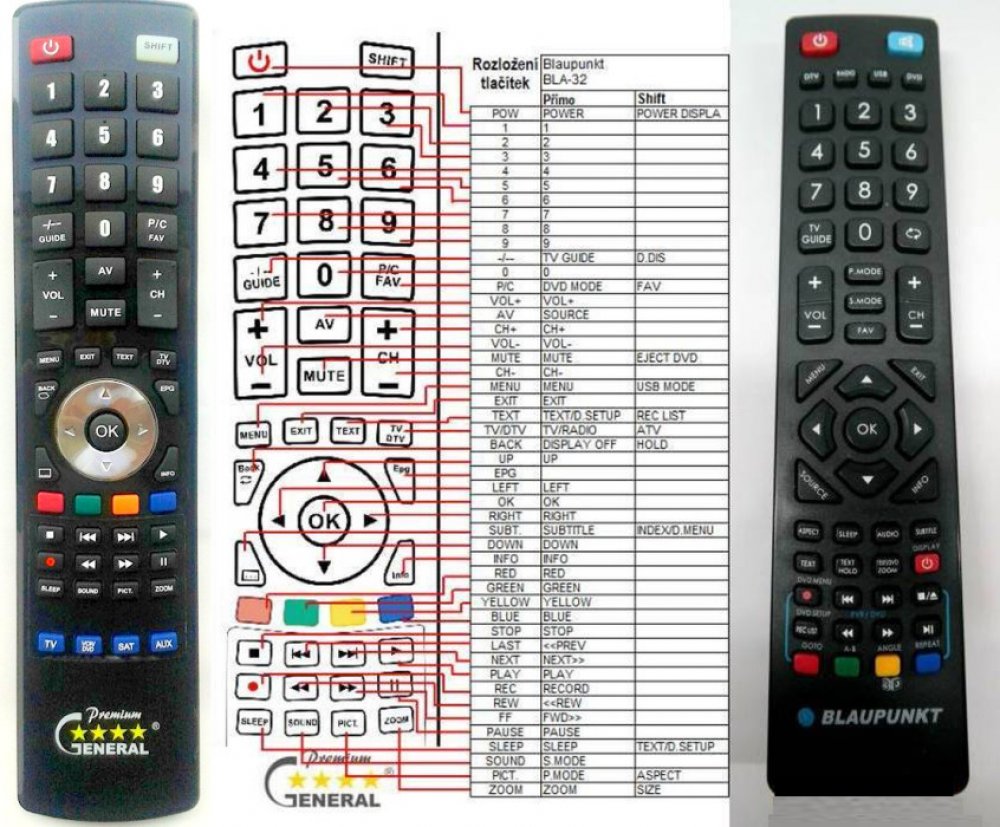 Náhradní dálkový ovladač BLAUPUNKT BLA-32 (BLA32). Dálkový ovladač je určen pro tyto modely BLAUPUNKT: 32/188, 32/188L, -GB-3B-HKDU-UK, -GB-3B-HKDU-UK BB, 215/54G-GB, 23/157J-GB-3B-HKDU-UK, 23/157J-GB-3B-HKDU-UK., 23/157L, 236/207 M, 236/207I, 32 | HD | USB | 100 AMR, 32-147I-GB-5B-HBCDUP, 32-147I-GB-5B-HBKUP, 32-188J-GB-5B-FHCU-UK, 32/112I-GB-5B-HBKUP-EU, 32/112L, 32/122I-GB-5B-HBKU-DE, 32/122L-GB-5B-HBKU-DE, 32/122L-GB-5B-HBKU-EU, 32/133 M, 32/133I-WB-11B, 32/138 M, 32/141I-GB-5B-FHBKU-EU, 32/148 M, 32/1480-GB-11B-EGBQU, 32/1480GB11BEGBQU, 32/148I-GW-SW2, 32/152R, 32/152R-GB-3B, 32/1881-GB-SB-FHBKU EU, 32/194J, 32/234I-GB-5B2, 321480GB11BEGBQU, 32148IGWSW2, 39/210I-GB-5B, 40/133 M, 40/138 M, 40/148 M, 40/233 M, 40/233I-GB-5B2-FHBKUP-EU, 42/188J-GB-5B-F3HCU-UK, 42/188N-GB5B-1HBOKUP-DE, 42I156B, 42I156B BB, 42I156B FHD LED DVB-T/C PVR, 43/134 M, 48/148 M, 48/148Z-GB-11B-FGBQUX-EU, 49/138 M, 49/148 M, 49/148O-GB-11B-FEGBQU-EU, 50/149Z-GB-5B2-FGKU, 50/211I-GB-5B, 50/211IGB5B, 55/138, B23A157TD, B32A133TCHD, B32FA112BBKPE627, B32FA112BK, B32J148T2CSHD, B32PW122BK, B40C189TCSFHD-10, B50A211TCFHD, BA21G54BFTCDUEBOM17A, BA21P207BFHKPE687, BA32L112BHCUE739, BA32L122BHKPE712, BA39L224B., BA42M333BF3GBKPE839, BA47F333BF3HBKPE839, BB 42I156B 23/157L, BB 42I156B 23/157L, BB-24F189B, BB-42I156B FHD LED DVB-T/C PVR, BB-42I156B FHD LED DVB-T/C PVR BLAUPUNKT, BB24F189B, BB42I156B, BLA-215/207J-GB-3B-FHKUP-EU, BLA-50/209, BP32K141B, BP32K141B LED, BQ32K147U, BS32E148-EU, BS32E148EU, BW39B68BFBKUE476, M26/74G. (Nemusí zde být uvedeny úplně všechny kompatibilní modely. Pokud si nejste jisti, sdělte nám svůj model (použijte online chat, e-mail, telefon), neprodleně zkontrolujeme a ověříme, zda je tento ovladač kompatibilní s Vaším přístrojem. Za poskytnutou informaci ručíme.) Jedná se o naprosto stejný dálkový ovladač jako originál. Jediný rozdíl je, že nemá logo BLAUPUNKT (to je jediný důvod, proč je levnější). Vysoká kvalita materiálu a zpracování, naprosto bezporuchový. Všechny naše dálkové ovladače kontrolujeme a testujeme, proto garantujeme jejich spolehlivost, nadstandartně dlouhý dosah signálu a výbornou citlivost tlačítek. Tento dálkový ovladač nemusíte nijak párovat, nevyžaduje žádné nastavování ani kódy. Stačí vložit baterie a funguje se všemi výše uvedenými modely.
