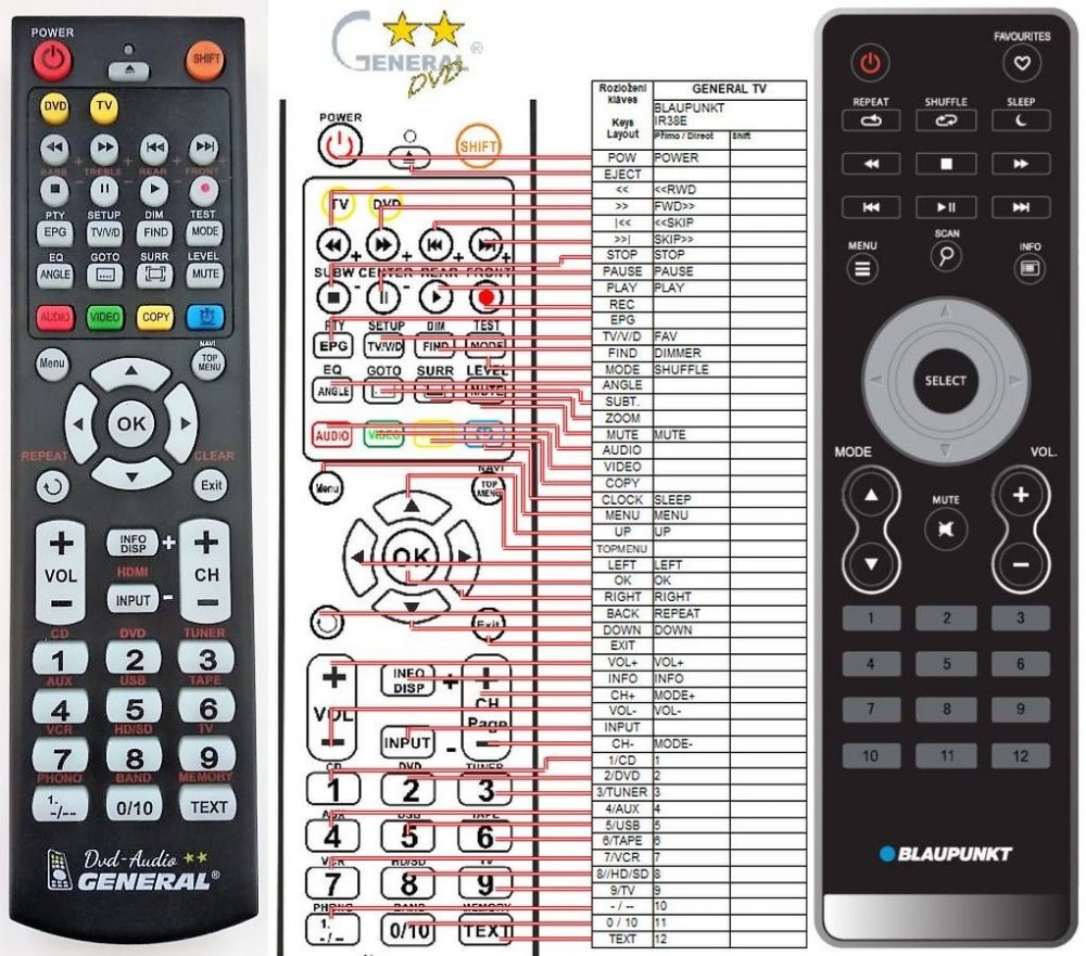 Náhradní dálkový ovladač BLAUPUNKT IR38E - 100procent náhrada 1:1 za originální dálkový ovladač. Dálkový ovladač je určen pro tyto modely BLAUPUNKT: IR-38E, IR38E. (Nemusí zde být uvedeny úplně všechny kompatibilní modely. Pokud si nejste jisti, sdělte nám svůj model (použijte online chat, e-mail, telefon), neprodleně zkontrolujeme a ověříme, zda je tento ovladač kompatibilní s Vaším přístrojem. Za poskytnutou informaci ručíme.) Ovladač je dodáván ve verzi značkového dálkového ovladače General DVD/AUDIO (zobrazen vlevo). Garantujeme Vám, že dostanete ovladač, který plně nahradí Váš původní originální ovladač a bude mít naprosto všechny funkce. Není to univerzální ovladač, ale ovladač, který je naprogramován a přímo určen pro modely přístrojů uvedené výše. Není třeba žádné párování, žádné kódy. Obdržíte od nás ovladač, který je připraven k použití - jediné, co musíte udělat, je vložit baterie a ovladač hned funguje. Podívejte se na obrázek ovladače a ujistěte se, že jsou v tabulce všechny funkce jako na původním originálním ovladači. Jedná se o plnohodnotný náhradní dálkový ovladač (není to „univerzál“). Má naprosto všechny funkce přesně jako originální ovladač. Záruční lhůta na ovladač je 2 roky. Dodáván také jednoduchý návod s mapováním funkcí. DOPLŇKOVÁ FUNKCE: Tento dálkový ovladač je možno naprogramovat na 1 další přístroj. Budete moci jedním ovladačem ovládat oba přístroje (např. DVD plus TV nebo SOUNDBAR plus TV apod.). Pokud nám do komentáře v objednávce napíšete model dalšího přístroje, naprogramujeme Vám ovladač na oba. Za tuto doplňkovou službu bude naúčtován příplatek k ceně ovladače 50 Kč: více informací
