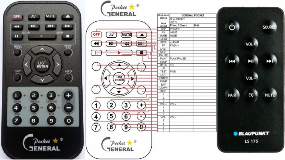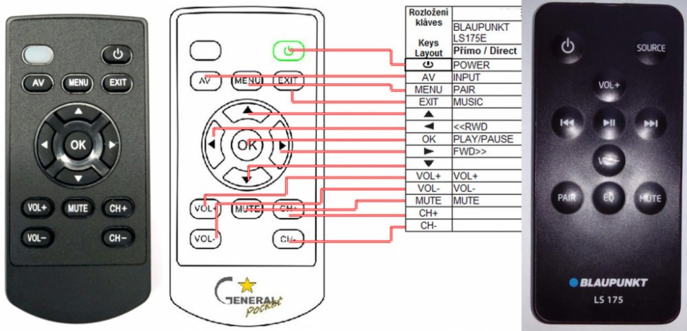 Náhradní dálkový ovladač BLAUPUNKT LS175 - 100% náhrada 1:1 za originální dálkový ovladač. Dálkový ovladač byl vyvinut speciálně na míru pro tyto modely značky BLAUPUNKT:LS-175, LS175. (Nemusí zde být uvedeny úplně všechny kompatibilní modely. Pokud si nejste jisti, sdělte nám svůj model (použijte online chat, e-mail, telefon), neprodleně zkontrolujeme a ověříme, zda je tento ovladač kompatibilní s Vaším přístrojem. Za poskytnutou informaci ručíme.) Ovladač je dodáván ve verzi značkového dálkového ovladače General POCKET (zobrazen vlevo). Garantujeme Vám, že dostanete ovladač, který plně nahradí Váš původní originální ovladač a bude mít naprosto všechny funkce stejné.Není to univerzální ovladač, ale ovladač, který je naprogramován a přímo určen pro modely přístrojů uvedené výše. Není třeba žádné párování, žádné kódy. Obdržíte od nás ovladač, který je připraven k použití - jediné, co musíte udělat, je vložit baterie a ovladač hned funguje. Podívejte se na obrázek ovladače a ujistěte se, že jsou v tabulce všechny funkce jako na původním originálním ovladači. Jedná se o plnohodnotný náhradní dálkový ovladač (není to „univerzál“). Má naprosto všechny funkce přesně jako originální ovladač. Záruční lhůta na ovladač je 3 roky. Dodáván také jednoduchý návod s mapováním funkcí.