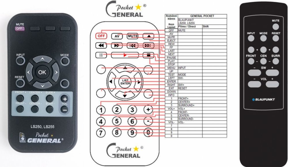 Dálkový ovladač BLAUPUNKT LS250, LS255 duplikát 1:1 originálního dálkového ovladače. Dálkový ovladač je určen pro tyto modely BLAUPUNKT: LS250, LS255. (Nemusí zde být uvedeny úplně všechny kompatibilní modely. Pokud si nejste jisti, sdělte nám svůj model (použijte online chat, e-mail, telefon), neprodleně zkontrolujeme a ověříme, zda je tento ovladač kompatibilní s Vaším přístrojem. Za poskytnutou informaci ručíme.) Dálkový ovladač General POCKET duplikát má naprosto všechny funkce a popisky tlačítek stejné jako originální dálkový ovladač. Není třeba nic nastavovat, žádné kódy, funguje ihned po vložení baterií se všemi výše uvedenými modely. Ovladač je dodáván ve verzi značkového dálkového ovladače General POCKET duplikát (zobrazen vlevo) Jedná se o ovladač vyrobený pro specifické zařízení – NENÍ to univerzální ovladač! Má naprosto všechny funkce jako originální dálkový ovladač. Má stejné popisky tlačítek, jako jste byli zvyklí z originálu. Popisky tlačítek jsou velmi odolné a nejdou seškrábat ani hrubou silou. 2 roky záruka. General POCKET duplikát byl navržen a vyroben přesně podle originálního dálkového ovladače tlačítko po tlačítku. Ovladač je vyvinut a testován v České republice a podléhá CE a ROHS standardům. SNADNÉ INTUITIVNÍ POUŽÍVÁNÍ: Na rozdíl od běžných náhradních ovladačů, General POCKET duplikát má 100procent odpovídající popisky tlačítek jako na originálním ovladači. Srovnání: Jiné univerzální nebo programovatelné náhrady mají kvůli snížení nákladů názvy/popisky a rozložení tlačítek univerzální, popisky tlačítek často neodpovídají funkci tlačítka a vyžadují tedy návody k použití. To často vede k nejasnostem, co které tlačítko dělá a stálá potřeba manuálu je velmi obtěžující. S ovladačem General POCKET duplikát žádný návod nepotřebujete, tlačítko dělá přesně to, co symbolizuje jeho popisek. GARANTUJEME 100procent FUNKČNOST: Narozdíl od jiných náhrad je každý dálkový ovladač General POCKET duplikát přímo v naší firmě navržen a testován na míru pro konkrétní zařízení tak, aby každé tlačítko odpovídalo funkci tlačítka originálního ovladače. Díky tomu můžeme zaručit 100procent funkčnost přesně jako originální ovladač. Samotné šasi bylo navrženo a vyvíjeno tak, aby bylo co nejodolnější a nejspolehlivější. Zároveň však byl kladen důraz na přívětivé rozložení tlačítek a popisky tlačítek jsou optimalizovány pro dobrou viditelnost. Materiály a součástky byly podrobeny důkladným testům, aby odolaly i tomu nejtvrdšímu zacházení a poskytovaly tak dlouhodobou životnost. Názvy tlačítek jsou na ovladači natištěny moderní technologií v naší firmě (naše vlastní know-how). Tisk je extrémně odolný a nelze jej setřít ani oškrábat. DUPLIKÁT originálního dálkového ovladače má naprosto stejné funkce a stejné názvy tlačítek jako Váš původní originální ovladač. Nemusíte nic nastavovat, po vložení baterií bude okamžitě fungovat, ovladač je již nakonfigurován tak, aby fungoval na modely uvedené výše. Nápisy na tlačítkách přesně odpovídají funkcím tlačítek, tiskneme je přesně podle originálního ovladače. Narozdíl od všech univerzálních a programovatelných náhrad, kde jsou názvy tlačítek univerzální a pro uživatele matoucí. Popisky jsou natištěny technicky vyspělou technologií v naší provozovně (naše know-how), jsou extrémně odolné, nejdou setřít ani seškrábat (např. nehtem). Opravdu jsme schopni vyrobit jakýkoliv dálkový ovladač! Splníme i požadavky na exotické ovladače, které nejsou (zatím) v naší nabídce. DUPLIKÁT = Nejlepší poměr cena/výkon. DOPORUČUJEME! DUPLIKÁT originálního dálkového ovladače má naprosto stejné funkce a stejné názvy tlačítek jako Váš původní originální ovladač. Nemusíte nic nastavovat, po vložení baterií bude okamžitě fungovat, ovladač je již nakonfigurován tak, aby fungoval na modely uvedené níže. Nápisy na tlacitkach přesně odpovídají funkcím tlačítek, tiskneme je přesně podle oriignálního ovladače. Narozdil od všech univerzalnich a programovatelnych náhrad, kde jsou názvy tlačítek univerzální a pro uživatele matoucí. Popisky jsou natištěny technicky vyspělou technologií v naší provozovně (naše know-how), jsou extrémně odolné, nejdou setřít ani seškrábat (např.nehtem). Opravdu jsme schopni vyrobit jakýkoliv dálkový ovladač! Splníme i požadavky na exotické ovladače, které nejsou (zatím :) v naší nabídce. DUPLIKÁT = Nejlepší poměr cena/výkon. DOPORUČUJEME!