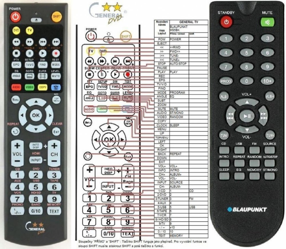 Náhradní dálkový ovladač BLAUPUNKT MS5BK - 100% náhrada 1:1 za originální dálkový ovladač. Dálkový ovladač byl vyvinut speciálně na míru pro tyto modely značky BLAUPUNKT:MS10BT, MS5BK. (Nemusí zde být uvedeny úplně všechny kompatibilní modely. Pokud si nejste jisti, sdělte nám svůj model (použijte online chat, e-mail, telefon), neprodleně zkontrolujeme a ověříme, zda je tento ovladač kompatibilní s Vaším přístrojem. Za poskytnutou informaci ručíme.) Ovladač je dodáván ve verzi značkového dálkového ovladače General DVD/AUDIO (zobrazen vlevo). Garantujeme Vám, že dostanete ovladač, který plně nahradí Váš původní originální ovladač a bude mít naprosto všechny funkce stejné.Není to univerzální ovladač, ale ovladač, který je naprogramován a přímo určen pro modely přístrojů uvedené výše. Není třeba žádné párování, žádné kódy. Obdržíte od nás ovladač, který je připraven k použití - jediné, co musíte udělat, je vložit baterie a ovladač hned funguje. Podívejte se na obrázek ovladače a ujistěte se, že jsou v tabulce všechny funkce jako na původním originálním ovladači. Jedná se o plnohodnotný náhradní dálkový ovladač (není to „univerzál“). Má naprosto všechny funkce přesně jako originální ovladač. Záruční lhůta na ovladač je 3 roky. Dodáván také jednoduchý návod s mapováním funkcí. DOPLŇKOVÁ FUNKCE: Tento dálkový ovladač je možno naprogramovat na 1 další přístroj. Budete moci jedním ovladačem ovládat oba přístroje (např. DVD+TV nebo SOUNDBAR+TV apod.). Pokud nám do komentáře v objednávce napíšete model dalšího přístroje, naprogramujeme Vám ovladač na oba. Za tuto doplňkovou službu bude naúčtován příplatek k ceně ovladače 50 Kč: více informací