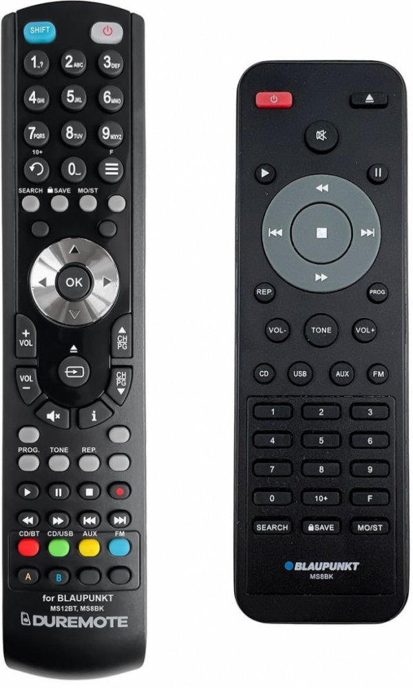 Dálkový ovladač BLAUPUNKT MS8BK duplikát 1:1 originálního dálkového ovladače. Dálkový ovladač General Duremote má naprosto všechny funkce a popisky tlačítek stejné jako originální dálkový ovladač. Není třeba nic nastavovat, žádné kódy, funguje ihned po vložení baterií se všemi výše uvedenými modely.Ovladač je dodáván ve verzi značkového dálkového ovladače General Duremote (zobrazen vlevo) Jedná se