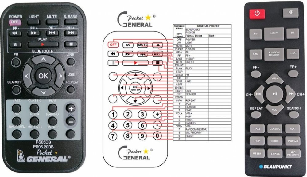 Dálkový ovladač BLAUPUNKT PS05DB duplikát 1:1 originálního dálkového ovladače. Dálkový ovladač je určen pro tyto modely BLAUPUNKT: PS05.2DB, PS052DB, PS05DB. (Nemusí zde být uvedeny úplně všechny kompatibilní modely. Pokud si nejste jisti, sdělte nám svůj model (použijte online chat, e-mail, telefon), neprodleně zkontrolujeme a ověříme, zda je tento ovladač kompatibilní s Vaším přístrojem. Za poskytnutou informaci ručíme.) Dálkový ovladač General POCKET duplikát má naprosto všechny funkce a popisky tlačítek stejné jako originální dálkový ovladač. Není třeba nic nastavovat, žádné kódy, funguje ihned po vložení baterií se všemi výše uvedenými modely. Ovladač je dodáván ve verzi značkového dálkového ovladače General POCKET duplikát (zobrazen vlevo) Jedná se o ovladač vyrobený pro specifické zařízení – NENÍ to univerzální ovladač! Má naprosto všechny funkce jako originální dálkový ovladač. Má stejné popisky tlačítek, jako jste byli zvyklí z originálu. Popisky tlačítek jsou velmi odolné a nejdou seškrábat ani hrubou silou. 2 roky záruka. General POCKET duplikát byl navržen a vyroben přesně podle originálního dálkového ovladače tlačítko po tlačítku. Ovladač je vyvinut a testován v České republice a podléhá CE a ROHS standardům. SNADNÉ INTUITIVNÍ POUŽÍVÁNÍ: Na rozdíl od běžných náhradních ovladačů, General POCKET duplikát má 100procent odpovídající popisky tlačítek jako na originálním ovladači. Srovnání: Jiné univerzální nebo programovatelné náhrady mají kvůli snížení nákladů názvy/popisky a rozložení tlačítek univerzální, popisky tlačítek často neodpovídají funkci tlačítka a vyžadují tedy návody k použití. To často vede k nejasnostem, co které tlačítko dělá a stálá potřeba manuálu je velmi obtěžující. S ovladačem General POCKET duplikát žádný návod nepotřebujete, tlačítko dělá přesně to, co symbolizuje jeho popisek. GARANTUJEME 100procent FUNKČNOST: Narozdíl od jiných náhrad je každý dálkový ovladač General POCKET duplikát přímo v naší firmě navržen a testován na míru pro konkrétní zařízení tak, aby každé tlačítko odpovídalo funkci tlačítka originálního ovladače. Díky tomu můžeme zaručit 100procent funkčnost přesně jako originální ovladač. Samotné šasi bylo navrženo a vyvíjeno tak, aby bylo co nejodolnější a nejspolehlivější. Zároveň však byl kladen důraz na přívětivé rozložení tlačítek a popisky tlačítek jsou optimalizovány pro dobrou viditelnost. Materiály a součástky byly podrobeny důkladným testům, aby odolaly i tomu nejtvrdšímu zacházení a poskytovaly tak dlouhodobou životnost. Názvy tlačítek jsou na ovladači natištěny moderní technologií v naší firmě (naše vlastní know-how). Tisk je extrémně odolný a nelze jej setřít ani oškrábat. DUPLIKÁT originálního dálkového ovladače má naprosto stejné funkce a stejné názvy tlačítek jako Váš původní originální ovladač. Nemusíte nic nastavovat, po vložení baterií bude okamžitě fungovat, ovladač je již nakonfigurován tak, aby fungoval na modely uvedené výše. Nápisy na tlačítkách přesně odpovídají funkcím tlačítek, tiskneme je přesně podle originálního ovladače. Narozdíl od všech univerzálních a programovatelných náhrad, kde jsou názvy tlačítek univerzální a pro uživatele matoucí. Popisky jsou natištěny technicky vyspělou technologií v naší provozovně (naše know-how), jsou extrémně odolné, nejdou setřít ani seškrábat (např. nehtem). Opravdu jsme schopni vyrobit jakýkoliv dálkový ovladač! Splníme i požadavky na exotické ovladače, které nejsou (zatím) v naší nabídce. DUPLIKÁT = Nejlepší poměr cena/výkon. DOPORUČUJEME! DUPLIKÁT originálního dálkového ovladače má naprosto stejné funkce a stejné názvy tlačítek jako Váš původní originální ovladač. Nemusíte nic nastavovat, po vložení baterií bude okamžitě fungovat, ovladač je již nakonfigurován tak, aby fungoval na modely uvedené níže. Nápisy na tlacitkach přesně odpovídají funkcím tlačítek, tiskneme je přesně podle oriignálního ovladače. Narozdil od všech univerzalnich a programovatelnych náhrad, kde jsou názvy tlačítek univerzální a pro uživatele matoucí. Popisky jsou natištěny technicky vyspělou technologií v naší provozovně (naše know-how), jsou extrémně odolné, nejdou setřít ani seškrábat (např.nehtem). Opravdu jsme schopni vyrobit jakýkoliv dálkový ovladač! Splníme i požadavky na exotické ovladače, které nejsou (zatím :) v naší nabídce. DUPLIKÁT = Nejlepší poměr cena/výkon. DOPORUČUJEME!