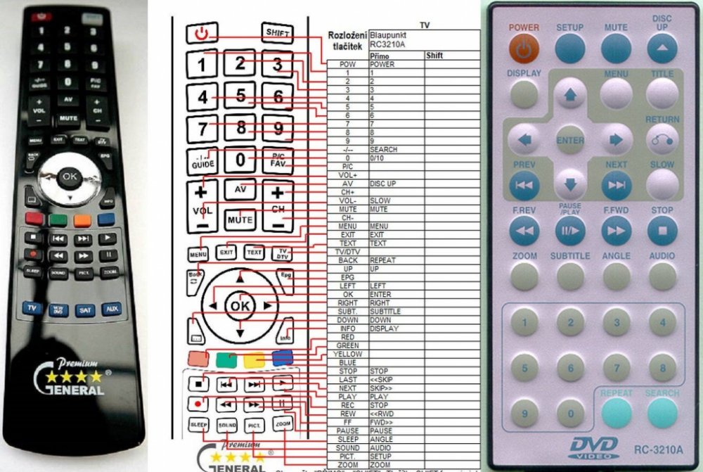 Náhradní dálkový ovladač BLAUPUNKT RC-3210A (RC3210A) - 100procent náhrada 1:1 za originální dálkový ovladač. Dálkový ovladač je určen pro tyto modely BLAUPUNKT: RC-3210A, RC3210A. (Nemusí zde být uvedeny úplně všechny kompatibilní modely. Pokud si nejste jisti, sdělte nám svůj model (použijte online chat, e-mail, telefon), neprodleně zkontrolujeme a ověříme, zda je tento ovladač kompatibilní s Vaším přístrojem. Za poskytnutou informaci ručíme.) Ovladač je dodáván ve verzi značkového dálkového ovladače General Premium (zobrazen vlevo). Garantujeme Vám, že dostanete ovladač, který plně nahradí Váš původní originální ovladač a bude mít naprosto všechny funkce. Není to univerzální ovladač, ale ovladač, který je naprogramován a přímo určen pro modely přístrojů uvedené výše. Není třeba žádné párování, žádné kódy. Obdržíte od nás ovladač, který je připraven k použití - jediné, co musíte udělat, je vložit baterie a ovladač hned funguje. Podívejte se na obrázek ovladače a ujistěte se, že jsou v tabulce všechny funkce jako na původním originálním ovladači. Jedná se o plnohodnotný náhradní dálkový ovladač (není to „univerzál“). Má naprosto všechny funkce přesně jako originální ovladač. Záruční lhůta na ovladač je 2 roky. Dodáván také jednoduchý návod s mapováním funkcí. DOPLŇKOVÁ FUNKCE: Tento dálkový ovladač je možno naprogramovat na 1-4 zařízení (celkem tedy 4). Budete moci jedním ovladačem ovládat několik různých přístrojů jedním ovladačem. Pokud nám do komentáře v objednávce napíšete modely dalších přístrojů, naprogramujeme Vám ovladač na všechny. Za tuto doplňkovou službu bude naúčtován příplatek k ceně ovladače 50 Kč: více informací V případě, že v budoucnu vyměníte/obměníte Vaši domácí elektroniku, jsme schopni Vám tento ovladač přeprogramovat na naprosto jakékoliv nové/á zařízení. Ovladač General přežije Váš stávající přístroj!