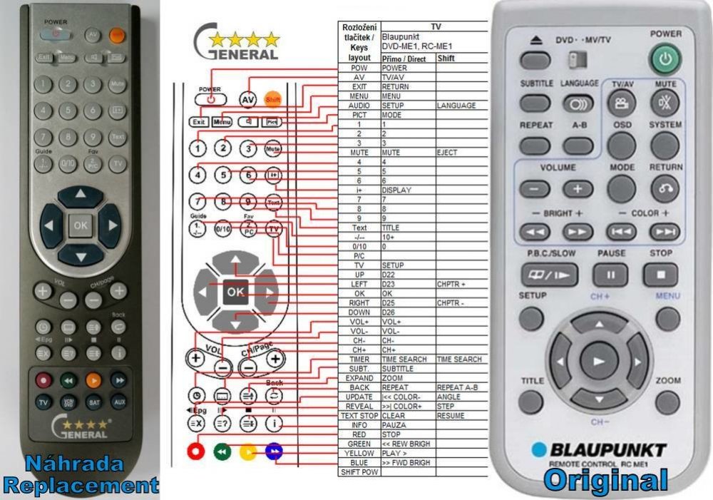 Náhradní dálkový ovladač BLAUPUNKT RC-ME1 (RCME1) - 100% náhrada 1:1 za originální dálkový ovladač. Dálkový ovladač byl vyvinut speciálně na míru pro tyto modely značky BLAUPUNKT:DVD-ME1, DVDME1. (Nemusí zde být uvedeny úplně všechny kompatibilní modely. Pokud si nejste jisti, sdělte nám svůj model (použijte online chat, e-mail, telefon), neprodleně zkontrolujeme a ověříme, zda je tento ovladač kompatibilní s Vaším přístrojem. Za poskytnutou informaci ručíme.) Ovladač je dodáván ve verzi značkového dálkového ovladače General DVD/AUDIO (zobrazen vlevo). Garantujeme Vám, že dostanete ovladač, který plně nahradí Váš původní originální ovladač a bude mít naprosto všechny funkce stejné.Není to univerzální ovladač, ale ovladač, který je naprogramován a přímo určen pro modely přístrojů uvedené výše. Není třeba žádné párování, žádné kódy. Obdržíte od nás ovladač, který je připraven k použití - jediné, co musíte udělat, je vložit baterie a ovladač hned funguje. Podívejte se na obrázek ovladače a ujistěte se, že jsou v tabulce všechny funkce jako na původním originálním ovladači. Jedná se o plnohodnotný náhradní dálkový ovladač (není to „univerzál“). Má naprosto všechny funkce přesně jako originální ovladač. Záruční lhůta na ovladač je 3 roky. Dodáván také jednoduchý návod s mapováním funkcí. DOPLŇKOVÁ FUNKCE: Tento dálkový ovladač je možno naprogramovat na 1 další přístroj. Budete moci jedním ovladačem ovládat oba přístroje (např. DVD+TV nebo SOUNDBAR+TV apod.). Pokud nám do komentáře v objednávce napíšete model dalšího přístroje, naprogramujeme Vám ovladač na oba. Za tuto doplňkovou službu bude naúčtován příplatek k ceně ovladače 50 Kč: více informací
