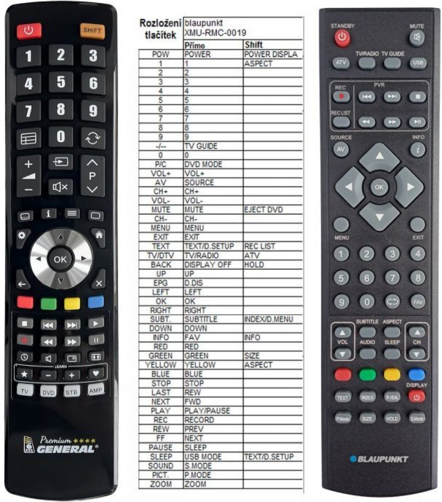 Náhradní dálkový ovladač BLAUPUNKT XMU-RMC-0034 (XMURMC0034) - 100% náhrada 1:1 za originální dálkový ovladač. Dokonalá 1:1 kopie navržená a vyrobená naší firmou – má všechny funkce originálního ovladače pro tyto modely značky BLAUPUNKT: B32K129TCHD, B46SHE188TCSFHD100PVR, 185194GHTFTCDUPUK, 21654GGBTCDUPUK, 23173NGBFHBQKDUPDE, 32173GGB5BTCUP, 32173IGB4BHBKUPEU, 32189IGB5B1HBKUDE, 32191IGB5BF3HBKUDE, 32194JGB4BHCUP, 3256IGB1BF3HBKUDE, 3256IGB1BHBKUPDE, 40/1891 - GB - 5B - FNBKUP - EU, 40/1891-GB-5B-FNBKUP-EU, 40188NGB5BFHBQKUPDE, 4048GGB3BFTCDUPUK, 4048GGBFTCDUPUK, 42188NGB5B1HBQKUPDE, B19C54TD X18554GGBTCDUP, B19FC155BK, B23C69TFHDD, B23P28TFHDD, B26SHE173TCFHD, B32A188TCSFHD100, B32A191TCFHD, B32A191TCFHD3D, B32A32TFHD, B32A56TCFHD3D, B40P188TCSFHD, BA40Z191BFBKPE553, BLA32188NGB5B1HBQKUEU, BLA32189IGB5B1HBKUDE, BLA39/2241-WB-5B, BLA42188NGB5B1HBQKUPEU, BLA46188NGB5BFHBQKUPEU, BW23T189BFBQKDUE, BW26G173BFBKUR, BW32C56BF3BKU469, BW32D129BBKUE561, BW32D188BFBKUE552, BW32O173BBKPE421, BW32T189B1BQKPE, BW42E188B1BQKPE332, LCD19-220, LCD22-220, LCD22C-244DW, LCD23-231, M32/74G GBFTCUP, M32/74G-GB-TCUP, M32/74GG, M32/74GGBFTCUP, M40/74G, M40/74G GB FTCUP, M40/74GGBFTCUP, W215194GHTFTCDUPUK, W2328GGBFTCDUPUK, W4048GGBFTCDUPUK, X23/50E-BB-FTCDUP4-UK, X23/50G-BB-FTCDUP, X2328GGBFTCDUPDE, X2328GGBFTCDUPUK, X2369GGBFTCDUP, X3254GGBFTCUPDE BX32A54TFHD. (Nemusí zde být uvedeny úplně všechny kompatibilní modely. Pokud si nejste jisti, sdělte nám svůj model (použijte online chat, e-mail, telefon), neprodleně zkontrolujeme a ověříme, zda je tento ovladač kompatibilní s Vaším přístrojem. Za poskytnutou informaci ručíme.) Ovladač je dodáván ve verzi značkového dálkového ovladače General Premium (zobrazen vlevo). Garantujeme Vám, že dostanete ovladač, který plně nahradí Váš původní originální ovladač a bude mít naprosto všechny funkce stejné.Není to univerzální ovladač, ale ovladač, který je naprogramován a přímo určen pro modely přístrojů uvedené výše. Není třeba žádné párování, žádné kódy. Obdržíte od ..