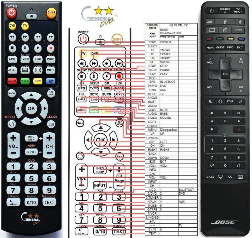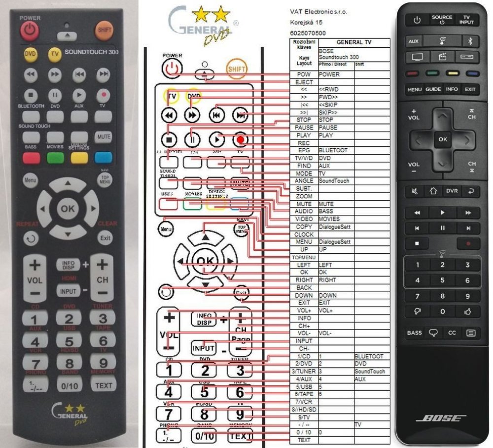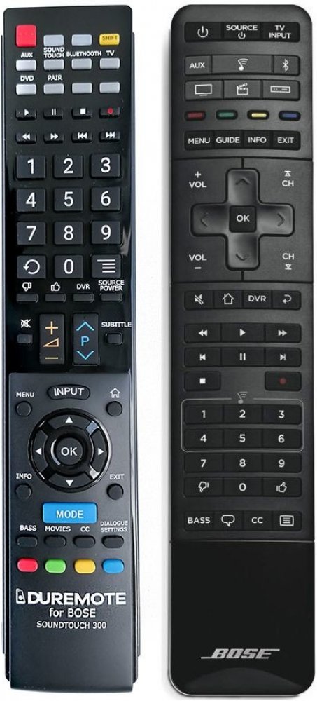 Dálkový ovladač BOSE SOUNDTOUCH 300 duplikát 1:1 originálního dálkového ovladače. Dálkový ovladač byl vyvinut speciálně na míru pro tyto modely značky BOSE:SOUNDBAR, SOUNDTOUCH 300, SOUNDTOUCH 300 SOUNDBAR, SOUNDTOUCH-300-SOUNDBAR, SOUNDTOUCH300SOUNDBAR. (Nemusí zde být uvedeny úplně všechny kompatibilní modely. Pokud si nejste jisti, sdělte nám svůj model (použijte online chat, e-mail, telefon), neprodleně zkontrolujeme a ověříme, zda je tento ovladač kompatibilní s Vaším přístrojem. Za poskytnutou informaci ručíme.) Dálkový ovladač General Duremote má naprosto všechny funkce a popisky tlačítek stejné jako originální dálkový ovladač. Není třeba nic nastavovat, žádné kódy, funguje ihned po vložení baterií se všemi výše uvedenými modely.Ovladač je dodáván ve verzi značkového dálkového ovladače General Duremote (zobrazen vlevo) Jedná se o ovladač vyrobený pro specifické zařízení – NENÍ to univerzální ovladač! Má naprosto všechny funkce jako originální dálkový ovladač. Má stejné popisky tlačítek, jako jste byli zvyklí z originálu. Popisky tlačítek jsou velmi odolné a nejdou seškrábat ani hrubou silou. 3 roky záruka.General Duremote byl navržen a vyroben přesně podle originálního dálkového ovladače tlačítko po tlačítku. Ovladač je vyvinut a testován v České republice a podléhá CE a ROHS standardům. SNADNÉ INTUITIVNÍ POUŽÍVÁNÍ: Na rozdíl od běžných náhradních ovladačů, General Duremote má 100% odpovídající popisky tlačítek jako na originálním ovladači. Srovnání: Jiné univerzální nebo programovatelné náhrady mají kvůli snížení nákladů názvy/popisky a rozložení tlačítek univerzální, popisky tlačítek často neodpovídají funkci tlačítka a vyžadují tedy návody k použití. To často vede k nejasnostem, co které tlačítko dělá a stálá potřeba manuálu je velmi obtěžující. S ovladačem General Duremote žádný návod nepotřebujete, tlačítko dělá přesně to, co symbolizuje jeho popisek.GARANTUJEME 100% FUNKČNOST: Narozdíl od jiných náhrad je každý dálkový ovladač General Duremote přímo v naší f..