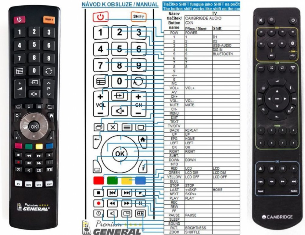 Dálkový ovladač CAMBRIDGE Audio CXA60, CXA80, CXC, CXN duplikát 1:1 originálního dálkového ovladače. Dokonalá 1:1 kopie navržená a vyrobená naší firmou – má všechny funkce originálního ovladače pro tyto modely značky CAMBRIDGE:CXA60, CXA61, CXA70, CXA80, CXA81, CXC, CXN SERIES 1, CXN V2. (Nemusí zde být uvedeny úplně všechny kompatibilní modely. Pokud si nejste jisti, sdělte nám svůj model (použijte online chat, e-mail, telefon), neprodleně zkontrolujeme a ověříme, zda je tento ovladač kompatibilní s Vaším přístrojem. Za poskytnutou informaci ručíme.) Dálkový ovladač General Duremote má naprosto všechny funkce a popisky tlačítek stejné jako originální dálkový ovladač. Není třeba nic nastavovat, žádné kódy, funguje ihned po vložení baterií se všemi výše uvedenými modely.Ovladač je dodáván ve verzi značkového dálkového ovladače General Duremote (zobrazen vlevo)Jedná se o ovladač vyrobený pro specifické zařízení – NENÍ to univerzální ovladač!Má naprosto všechny funkce jako originální dálkový ovladač.Má stejné popisky tlačítek, jako jste byli zvyklí z originálu.Popisky tlačítek jsou velmi odolné a nejdou seškrábat ani hrubou silou.3 roky záruka.Nulová poruchovost tohoto modelu! Nemáme zádné reklamace a přitom je to náš nejprodávanější ovladač.General Duremote byl tlačítko po tlačítku navržen a vyroben přesně podle originálního dálkového ovladače na obrázku vpravo. Výroben v naší firmě v Ostravě, vývoj, výroba i atesty v České republice - splňuje CE a ROHS standardy.SNADNÉ INTUITIVNÍ POUŽÍVÁNÍ: Na rozdíl od běžných náhradních ovladačů, General Duremote má 100% stejné popisky tlačítek jako Váš původní originální dálkový ovladač.Srovnání: Ostatní univerzální nebo programovatelné náhrady mají (kvůli úspoře nákladů) univerzální rozložení s nesprávně označenými tlačítky, a proto potřebují návod (tabulku funkcí), který říká, jaká je skutečná funkce jednotlivých tlačítek. To může způsobovat zmatek a nutnost neustálého vracení se k návodu je pro koncového uživatele obtěžující. Naopak při používání našeho ..