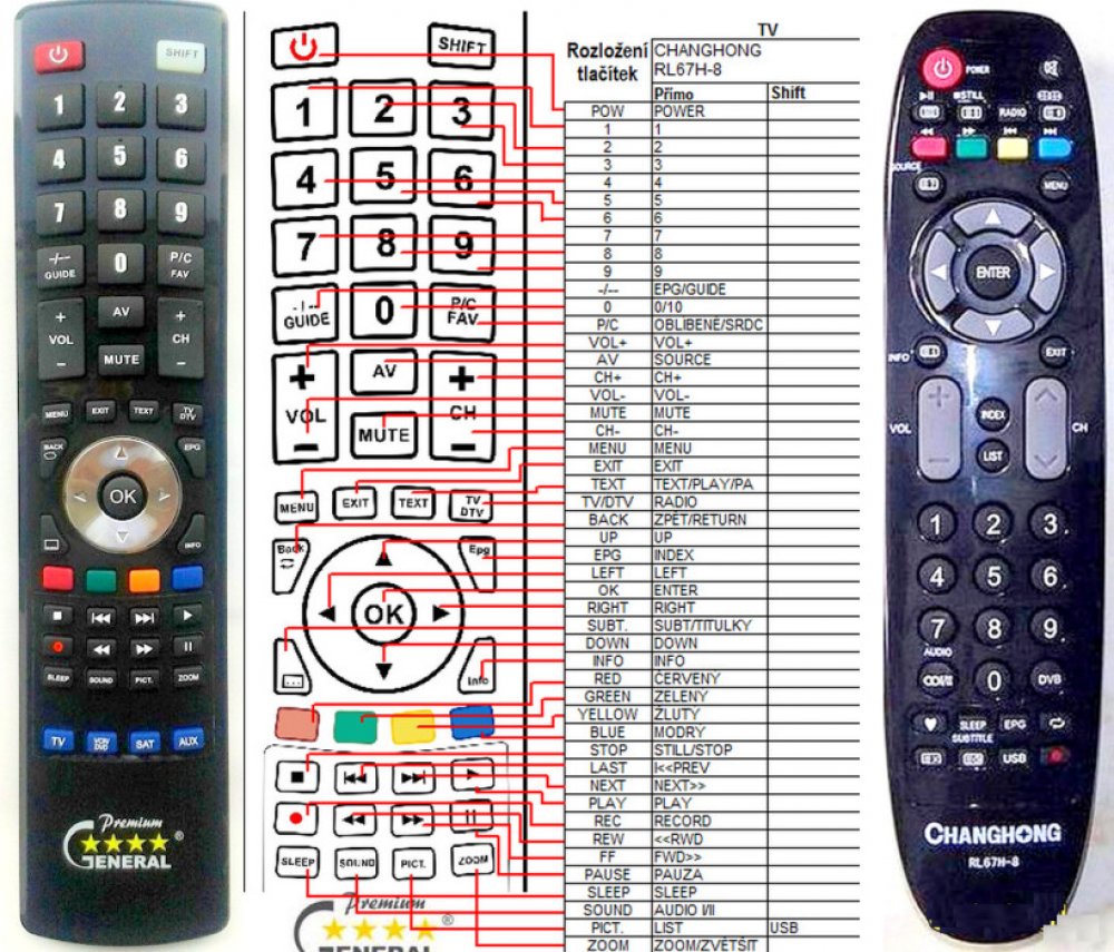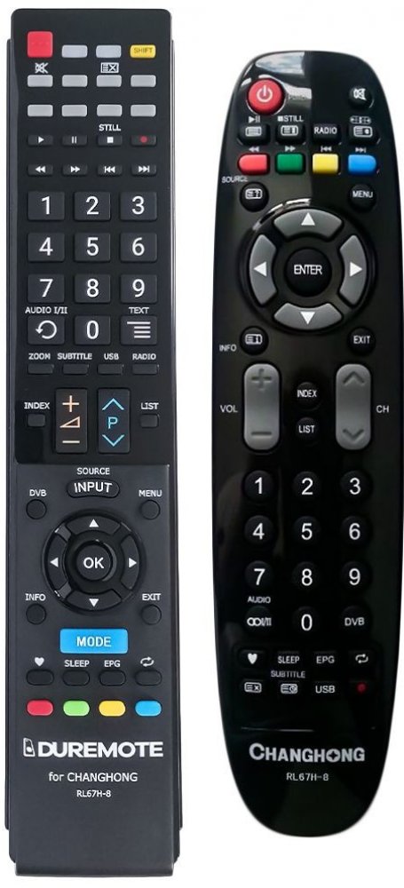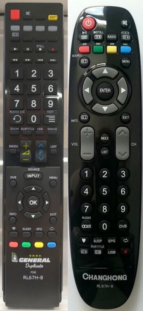 Náhradní dálkový ovladač CHANGHONG RL67H-8 (RL67H8). Dálkový ovladač byl vyvinut speciálně na míru pro tyto modely značky CHANGHONG:24D1000SD, 28C2000DS, 28C2000S, 29A6500, 29B1000S, 32B1000H, 32C2000H, 32C2200DS, 50C2000H, 50C2000IS, LED19D2000H, LED19T868H, LED22B1000HC, LED22D2000H, LED22T868, LED24D1000SD, LED28C2000DS, LED28C2000H, LED28C2000S, LED28C2200H, LED29A6500H, LED29B1000S, LED32B100...
