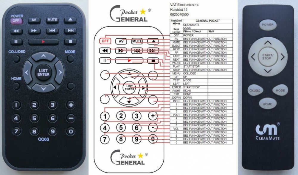 Dálkový ovladač Cleanmate QQ6S duplikát 1:1 originálního dálkového ovladače. Dálkový ovladač byl vyvinut speciálně na míru pro tyto modely značky Cleanmate:QQ6, QQ6S. (Nemusí zde být uvedeny úplně všechny kompatibilní modely. Pokud si nejste jisti, sdělte nám svůj model (použijte online chat, e-mail, telefon), neprodleně zkontrolujeme a ověříme, zda je tento ovladač kompatibilní s Vaším přístrojem. Za poskytnutou informaci ručíme.) Dálkový ovladač General POCKET duplikát má naprosto všechny funkce a popisky tlačítek stejné jako originální dálkový ovladač. Není třeba nic nastavovat, žádné kódy, funguje ihned po vložení baterií se všemi výše uvedenými modely.Ovladač je dodáván ve verzi značkového dálkového ovladače General POCKET duplikát (zobrazen vlevo) Jedná se o ovladač vyrobený pro specifické zařízení – NENÍ to univerzální ovladač! Má naprosto všechny funkce jako originální dálkový ovladač. Má stejné popisky tlačítek, jako jste byli zvyklí z originálu. Popisky tlačítek jsou velmi odolné a nejdou seškrábat ani hrubou silou. 3 roky záruka.General POCKET duplikát byl navržen a vyroben přesně podle originálního dálkového ovladače tlačítko po tlačítku. Ovladač je vyvinut a testován v České republice a podléhá CE a ROHS standardům. SNADNÉ INTUITIVNÍ POUŽÍVÁNÍ: Na rozdíl od běžných náhradních ovladačů, General POCKET duplikát má 100% odpovídající popisky tlačítek jako na originálním ovladači. Srovnání: Jiné univerzální nebo programovatelné náhrady mají kvůli snížení nákladů názvy/popisky a rozložení tlačítek univerzální, popisky tlačítek často neodpovídají funkci tlačítka a vyžadují tedy návody k použití. To často vede k nejasnostem, co které tlačítko dělá a stálá potřeba manuálu je velmi obtěžující. S ovladačem General POCKET duplikát žádný návod nepotřebujete, tlačítko dělá přesně to, co symbolizuje jeho popisek.GARANTUJEME 100% FUNKČNOST: Narozdíl od jiných náhrad je každý dálkový ovladač General POCKET duplikát přímo v naší firmě navržen a testován na míru pro konkrétní ..