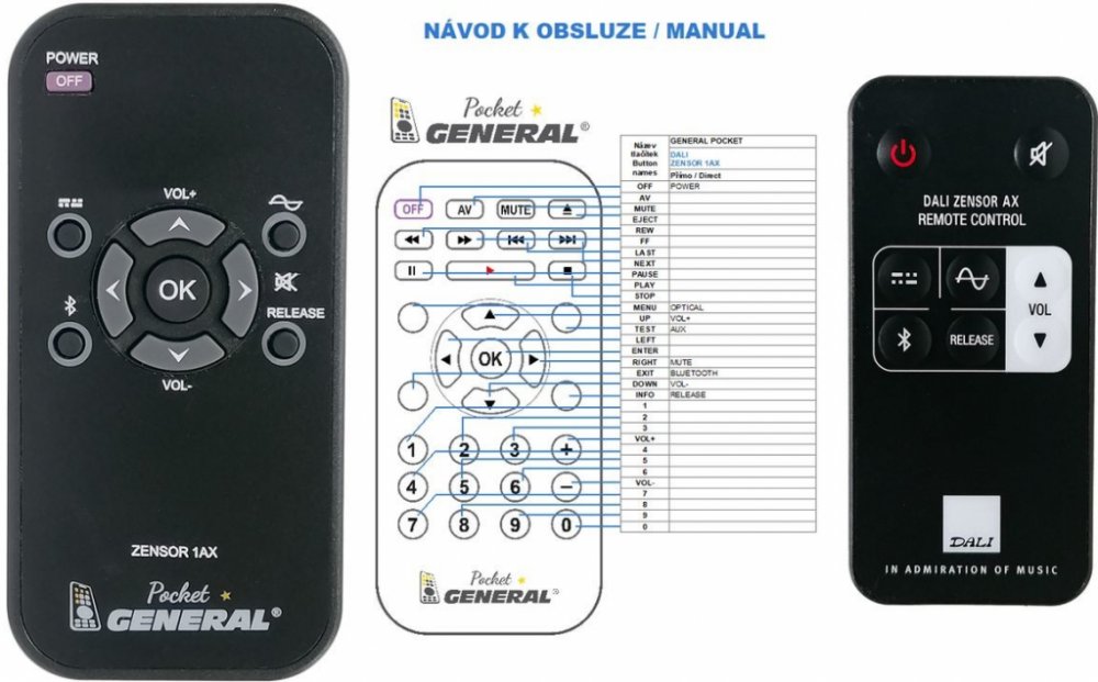 Dálkový ovladač DALI ZENSOR 1AX duplikát 1:1 originálního dálkového ovladače. Dálkový ovladač je určen pro tyto modely DALI: 5AX, ZENSOR 1AX, ZENSOR1AX. (Nemusí zde být uvedeny úplně všechny kompatibilní modely. Pokud si nejste jisti, sdělte nám svůj model (použijte online chat, e-mail, telefon), neprodleně zkontrolujeme a ověříme, zda je tento ovladač kompatibilní s Vaším přístrojem. Za poskytnutou informaci ručíme.) Dálkový ovladač General POCKET duplikát má naprosto všechny funkce a popisky tlačítek stejné jako originální dálkový ovladač. Není třeba nic nastavovat, žádné kódy, funguje ihned po vložení baterií se všemi výše uvedenými modely. Ovladač je dodáván ve verzi značkového dálkového ovladače General POCKET duplikát (zobrazen vlevo) Jedná se o ovladač vyrobený pro specifické zařízení – NENÍ to univerzální ovladač! Má naprosto všechny funkce jako originální dálkový ovladač. Má stejné popisky tlačítek, jako jste byli zvyklí z originálu. Popisky tlačítek jsou velmi odolné a nejdou seškrábat ani hrubou silou. 2 roky záruka. General POCKET duplikát byl navržen a vyroben přesně podle originálního dálkového ovladače tlačítko po tlačítku. Ovladač je vyvinut a testován v České republice a podléhá CE a ROHS standardům. SNADNÉ INTUITIVNÍ POUŽÍVÁNÍ: Na rozdíl od běžných náhradních ovladačů, General POCKET duplikát má 100procent odpovídající popisky tlačítek jako na originálním ovladači. Srovnání: Jiné univerzální nebo programovatelné náhrady mají kvůli snížení nákladů názvy/popisky a rozložení tlačítek univerzální, popisky tlačítek často neodpovídají funkci tlačítka a vyžadují tedy návody k použití. To často vede k nejasnostem, co které tlačítko dělá a stálá potřeba manuálu je velmi obtěžující. S ovladačem General POCKET duplikát žádný návod nepotřebujete, tlačítko dělá přesně to, co symbolizuje jeho popisek. GARANTUJEME 100procent FUNKČNOST: Narozdíl od jiných náhrad je každý dálkový ovladač General POCKET duplikát přímo v naší firmě navržen a testován na míru pro konkrétní zařízení tak, aby každé tlačítko odpovídalo funkci tlačítka originálního ovladače. Díky tomu můžeme zaručit 100procent funkčnost přesně jako originální ovladač. Samotné šasi bylo navrženo a vyvíjeno tak, aby bylo co nejodolnější a nejspolehlivější. Zároveň však byl kladen důraz na přívětivé rozložení tlačítek a popisky tlačítek jsou optimalizovány pro dobrou viditelnost. Materiály a součástky byly podrobeny důkladným testům, aby odolaly i tomu nejtvrdšímu zacházení a poskytovaly tak dlouhodobou životnost. Názvy tlačítek jsou na ovladači natištěny moderní technologií v naší firmě (naše vlastní know-how). Tisk je extrémně odolný a nelze jej setřít ani oškrábat. DUPLIKÁT originálního dálkového ovladače má naprosto stejné funkce a stejné názvy tlačítek jako Váš původní originální ovladač. Nemusíte nic nastavovat, po vložení baterií bude okamžitě fungovat, ovladač je již nakonfigurován tak, aby fungoval na modely uvedené výše. Nápisy na tlačítkách přesně odpovídají funkcím tlačítek, tiskneme je přesně podle originálního ovladače. Narozdíl od všech univerzálních a programovatelných náhrad, kde jsou názvy tlačítek univerzální a pro uživatele matoucí. Popisky jsou natištěny technicky vyspělou technologií v naší provozovně (naše know-how), jsou extrémně odolné, nejdou setřít ani seškrábat (např. nehtem). Opravdu jsme schopni vyrobit jakýkoliv dálkový ovladač! Splníme i požadavky na exotické ovladače, které nejsou (zatím) v naší nabídce. DUPLIKÁT = Nejlepší poměr cena/výkon. DOPORUČUJEME! DUPLIKÁT originálního dálkového ovladače má naprosto stejné funkce a stejné názvy tlačítek jako Váš původní originální ovladač. Nemusíte nic nastavovat, po vložení baterií bude okamžitě fungovat, ovladač je již nakonfigurován tak, aby fungoval na modely uvedené níže. Nápisy na tlacitkach přesně odpovídají funkcím tlačítek, tiskneme je přesně podle oriignálního ovladače. Narozdil od všech univerzalnich a programovatelnych náhrad, kde jsou názvy tlačítek univerzální a pro uživatele matoucí. Popisky jsou natištěny technicky vyspělou technologií v naší provozovně (naše know-how), jsou extrémně odolné, nejdou setřít ani seškrábat (např.nehtem). Opravdu jsme schopni vyrobit jakýkoliv dálkový ovladač! Splníme i požadavky na exotické ovladače, které nejsou (zatím :) v naší nabídce. DUPLIKÁT = Nejlepší poměr cena/výkon. DOPORUČUJEME!