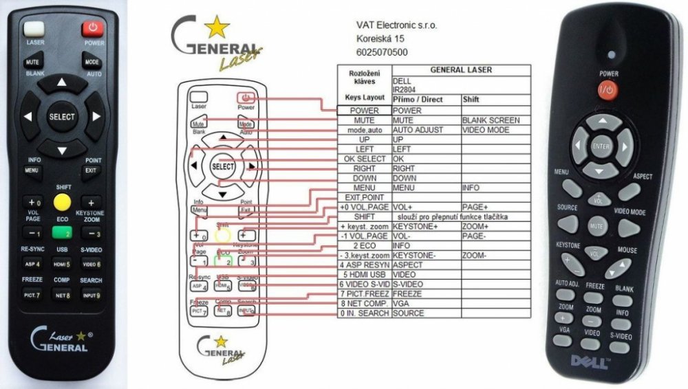 Náhradní dálkový ovladač DELL IR2804 - 100% náhrada 1:1 za originální dálkový ovladač. Dálkový ovladač byl vyvinut speciálně na míru pro tyto modely značky DELL:1210S, 1410X, 1420X, 1510X, 1550, 1610HS, 1650. (Nemusí zde být uvedeny úplně všechny kompatibilní modely. Pokud si nejste jisti, sdělte nám svůj model (použijte online chat, e-mail, telefon), neprodleně zkontrolujeme a ověříme, zda je tento ovladač kompatibilní s Vaším přístrojem. Za poskytnutou informaci ručíme.) Ovladač je dodáván ve verzi značkového dálkového ovladače General LASER (zobrazen vlevo). Garantujeme Vám, že dostanete ovladač, který plně nahradí Váš původní originální ovladač a bude mít naprosto všechny funkce stejné.Není to univerzální ovladač, ale ovladač, který je naprogramován a přímo určen pro modely projektorů uvedené výše. Není třeba žádné párování, žádné kódy. Obdržíte od nás ovladač, který je připraven k použití - jediné, co musíte udělat, je vložit baterie a ovladač hned funguje. Jedná se o plnohodnotný náhradní dálkový ovladač speciálně navržen pro projektory (není to „univerzál“). Má naprosto všechny funkce přesně jako originální ovladač. Ovladač má přidanou funkci LASEROVÉ UKAZOVÁTKO. Dodáván také jednoduchý návod s mapováním funkcí.V případě, že v budoucnu vyměníte Váš projektor za jinou značku/model, jsme schopni Vám tento ovladač přeprogramovat na naprosto jakékoliv nové/á zařízení. Ovladač General LASER přežije Váš stávající přístroj!