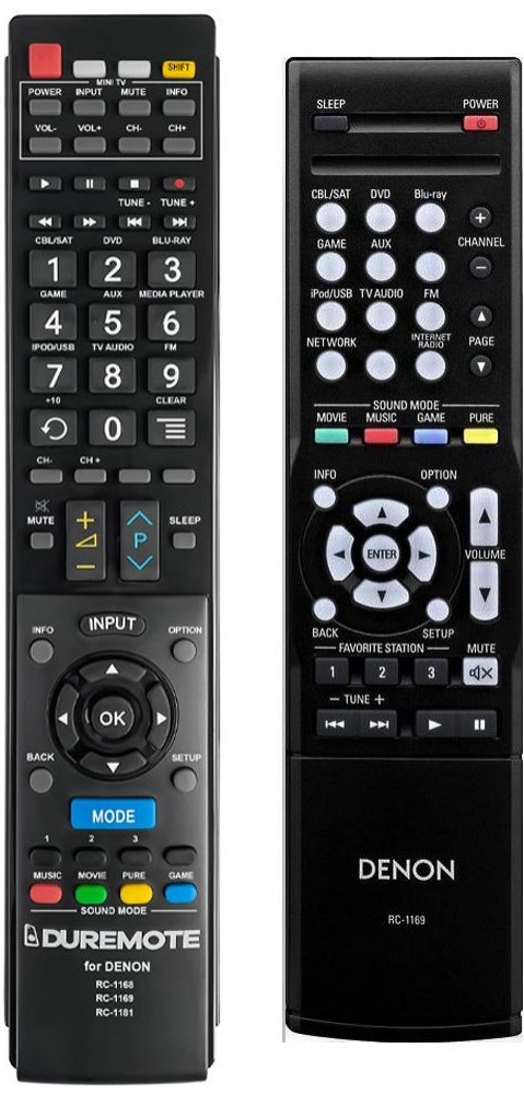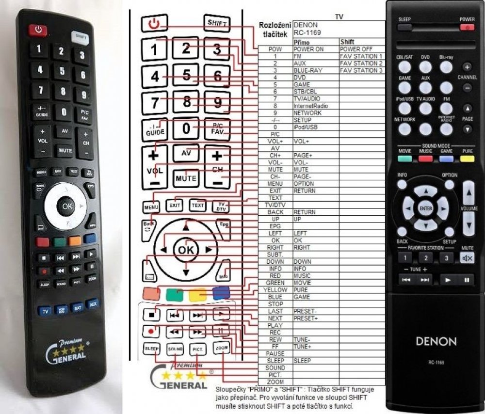 Náhradní dálkový ovladač DENON RC-1169 (RC1169). Dálkový ovladač je určen pro tyto modely DENON: AVR-1613, AVR-1713, AVR1613, AVR1713. (Nemusí zde být uvedeny úplně všechny kompatibilní modely. Pokud si nejste jisti, sdělte nám svůj model (použijte online chat, e-mail, telefon), neprodleně zkontrolujeme a ověříme, zda je tento ovladač kompatibilní s Vaším přístrojem. Za poskytnutou informaci ručíme.) Jedná se o naprosto stejný dálkový ovladač jako originál. Jediný rozdíl je, že nemá logo DENON (to je jediný důvod, proč je levnější). Vysoká kvalita materiálu a zpracování, naprosto bezporuchový. Všechny naše dálkové ovladače kontrolujeme a testujeme, proto garantujeme jejich spolehlivost, nadstandartně dlouhý dosah signálu a výbornou citlivost tlačítek. Tento dálkový ovladač nemusíte nijak párovat, nevyžaduje žádné nastavování ani kódy. Stačí vložit baterie a funguje se všemi výše uvedenými modely.