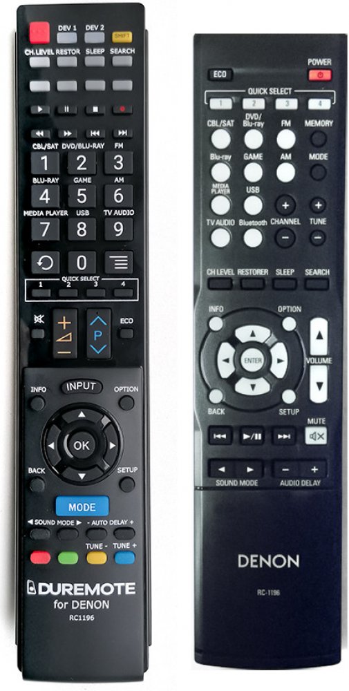 Dálkový ovladač DENON RC-1196 (RC1196) duplikát 1:1 originálního dálkového ovladače. Dálkový ovladač byl vyvinut speciálně na míru pro tyto modely značky DENON:AVR-S500BT, AVR-S510, AVR-S510BT, AVR-X510BT, AVR-X520BT, AVR-X520BT, AVRX520BT, AVRS500BT, AVRS510, AVRS510BT, AVRX510BT, AVRX520BT. (Nemusí zde být uvedeny úplně všechny kompatibilní modely. Pokud si nejste jisti, sdělte nám svůj model (použijte online chat, e-mail, telefon), neprodleně zkontrolujeme a ověříme, zda je tento ovladač kompatibilní s Vaším přístrojem. Za poskytnutou informaci ručíme.) Dálkový ovladač General Duremote má naprosto všechny funkce a popisky tlačítek stejné jako originální dálkový ovladač. Není třeba nic nastavovat, žádné kódy, funguje ihned po vložení baterií se všemi výše uvedenými modely.Ovladač je dodáván ve verzi značkového dálkového ovladače General Duremote (zobrazen vlevo) Jedná se o ovladač vyrobený pro specifické zařízení – NENÍ to univerzální ovladač! Má naprosto všechny funkce jako originální dálkový ovladač. Má stejné popisky tlačítek, jako jste byli zvyklí z originálu. Popisky tlačítek jsou velmi odolné a nejdou seškrábat ani hrubou silou. 3 roky záruka.General Duremote byl navržen a vyroben přesně podle originálního dálkového ovladače tlačítko po tlačítku. Ovladač je vyvinut a testován v České republice a podléhá CE a ROHS standardům. SNADNÉ INTUITIVNÍ POUŽÍVÁNÍ: Na rozdíl od běžných náhradních ovladačů, General Duremote má 100% odpovídající popisky tlačítek jako na originálním ovladači. Srovnání: Jiné univerzální nebo programovatelné náhrady mají kvůli snížení nákladů názvy/popisky a rozložení tlačítek univerzální, popisky tlačítek často neodpovídají funkci tlačítka a vyžadují tedy návody k použití. To často vede k nejasnostem, co které tlačítko dělá a stálá potřeba manuálu je velmi obtěžující. S ovladačem General Duremote žádný návod nepotřebujete, tlačítko dělá přesně to, co symbolizuje jeho popisek.GARANTUJEME 100% FUNKČNOST: Narozdíl od jiných náhrad je každý dálkový ..