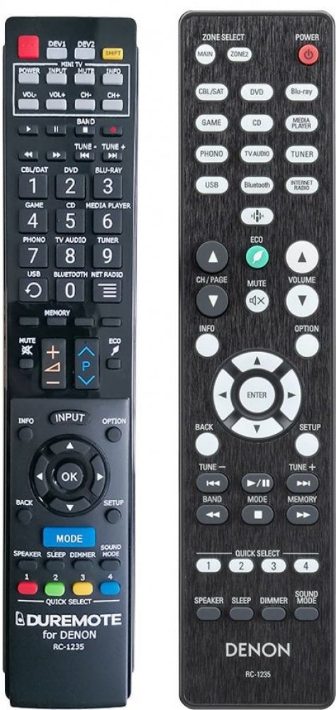 Dálkový ovladač DENON RC-1235 (RC1235) duplikát 1:1 originálního dálkového ovladače. Dálkový ovladač je určen pro tyto modely DENON:DRA-800H, DRA800H. (Nemusí zde být uvedeny úplně všechny kompatibilní modely. Pokud si nejste jisti, sdělte nám svůj model (použijte online chat, e-mail, telefon), neprodleně zkontrolujeme a ověříme, zda je tento ovladač kompatibilní s Vaším přístrojem. Za poskytnutou informaci ručíme.) Dálkový ovladač General Duremote má naprosto všechny funkce a popisky tlačítek stejné jako originální dálkový ovladač. Není třeba nic nastavovat, žádné kódy, funguje ihned po vložení baterií se všemi výše uvedenými modely.Ovladač je dodáván ve verzi značkového dálkového ovladače General Duremote (zobrazen vlevo) Jedná se o ovladač vyrobený pro specifické zařízení – NENÍ to univerzální ovladač! Má naprosto všechny funkce jako originální dálkový ovladač. Má stejné popisky tlačítek, jako jste byli zvyklí z originálu. Popisky tlačítek jsou velmi odolné a nejdou seškrábat ani hrubou silou. 2 roky záruka.General Duremote byl navržen a vyroben přesně podle originálního dálkového ovladače tlačítko po tlačítku. Ovladač je vyvinut a testován v České republice a podléhá CE a ROHS standardům. SNADNÉ INTUITIVNÍ POUŽÍVÁNÍ: Na rozdíl od běžných náhradních ovladačů, General Duremote má 100% odpovídající popisky tlačítek jako na originálním ovladači. Srovnání: Jiné univerzální nebo programovatelné náhrady mají kvůli snížení nákladů názvy/popisky a rozložení tlačítek univerzální, popisky tlačítek často neodpovídají funkci tlačítka a vyžadují tedy návody k použití. To často vede k nejasnostem, co které tlačítko dělá a stálá potřeba manuálu je velmi obtěžující. S ovladačem General Duremote žádný návod nepotřebujete, tlačítko dělá přesně to, co symbolizuje jeho popisek.GARANTUJEME 100% FUNKČNOST: Narozdíl od jiných náhrad je každý dálkový ovladač General Duremote přímo v naší firmě navržen a testován na míru pro konkrétní zařízení tak, aby každé tlačítko odpovídalo funkci tlačítk..