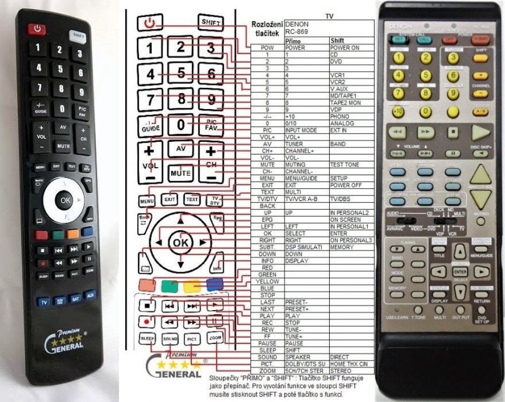 Náhradní dálkový ovladač DENON RC-860 (3990546008) (RC860 (3990546008)) - 100% náhrada 1:1 za originální dálkový ovladač. Dálkový ovladač byl vyvinut speciálně na míru pro tyto modely značky DENON:AV-0033, AVG3300, AVR-3300, AVR-4800, AVR3300, AVR3300KE3. (Nemusí zde být uvedeny úplně všechny kompatibilní modely. Pokud si nejste jisti, sdělte nám svůj model (použijte online chat, e-mail, telefon), neprodleně zkontrolujeme a ověříme, zda je tento ovladač kompatibilní s Vaším přístrojem. Za poskytnutou informaci ručíme.) Ovladač je dodáván ve verzi značkového dálkového ovladače General Premium (zobrazen vlevo). Garantujeme Vám, že dostanete ovladač, který plně nahradí Váš původní originální ovladač a bude mít naprosto všechny funkce stejné.Není to univerzální ovladač, ale ovladač, který je naprogramován a přímo určen pro modely přístrojů uvedené výše. Není třeba žádné párování, žádné kódy. Obdržíte od nás ovladač, který je připraven k použití - jediné, co musíte udělat, je vložit baterie a ovladač hned funguje. Podívejte se na obrázek ovladače a ujistěte se, že jsou v tabulce všechny funkce jako na původním originálním ovladači. Jedná se o plnohodnotný náhradní dálkový ovladač (není to „univerzál“). Má naprosto všechny funkce přesně jako originální ovladač. Záruční lhůta na ovladač je 3 roky. Dodáván také jednoduchý návod s mapováním funkcí. DOPLŇKOVÁ FUNKCE: Tento dálkový ovladač je možno naprogramovat na 1-4 zařízení (celkem tedy 4). Budete moci jedním ovladačem ovládat několik různých přístrojů jedním ovladačem. Pokud nám do komentáře v objednávce napíšete modely dalších přístrojů, naprogramujeme Vám ovladač na všechny. Za tuto doplňkovou službu bude naúčtován příplatek k ceně ovladače 50 Kč: více informacíV případě, že v budoucnu vyměníte/obměníte Vaši domácí elektroniku, jsme schopni Vám tento ovladač přeprogramovat na naprosto jakékoliv nové/á zařízení. Ovladač General přežije Váš stávající přístroj!