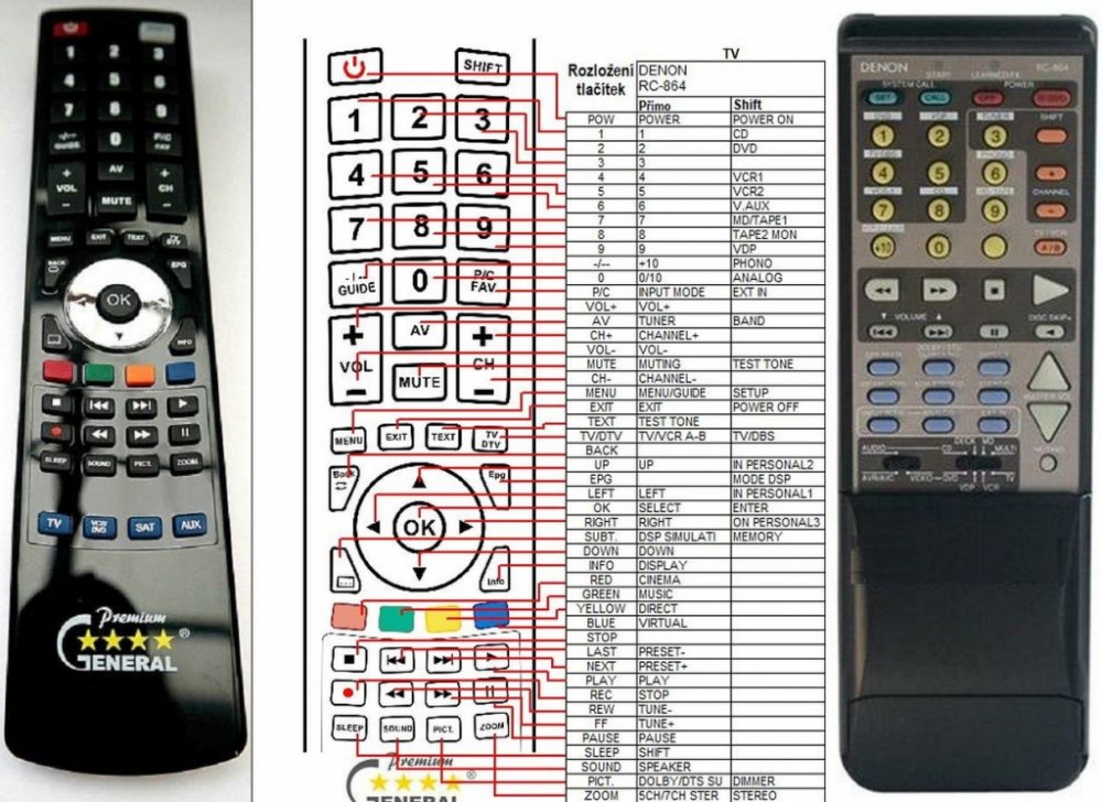 Náhradní dálkový ovladač DENON RC-864 (RC864) - 100procent náhrada 1:1 za originální dálkový ovladač. Dálkový ovladač je určen pro tyto modely DENON: AVR-3300. (Nemusí zde být uvedeny úplně všechny kompatibilní modely. Pokud si nejste jisti, sdělte nám svůj model (použijte online chat, e-mail, telefon), neprodleně zkontrolujeme a ověříme, zda je tento ovladač kompatibilní s Vaším přístrojem. Za poskytnutou informaci ručíme.) Ovladač je dodáván ve verzi značkového dálkového ovladače General Premium (zobrazen vlevo). Garantujeme Vám, že dostanete ovladač, který plně nahradí Váš původní originální ovladač a bude mít naprosto všechny funkce. Není to univerzální ovladač, ale ovladač, který je naprogramován a přímo určen pro modely přístrojů uvedené výše. Není třeba žádné párování, žádné kódy. Obdržíte od nás ovladač, který je připraven k použití - jediné, co musíte udělat, je vložit baterie a ovladač hned funguje. Podívejte se na obrázek ovladače a ujistěte se, že jsou v tabulce všechny funkce jako na původním originálním ovladači. Jedná se o plnohodnotný náhradní dálkový ovladač (není to „univerzál“). Má naprosto všechny funkce přesně jako originální ovladač. Záruční lhůta na ovladač je 2 roky. Dodáván také jednoduchý návod s mapováním funkcí. DOPLŇKOVÁ FUNKCE: Tento dálkový ovladač je možno naprogramovat na 1-4 zařízení (celkem tedy 4). Budete moci jedním ovladačem ovládat několik různých přístrojů jedním ovladačem. Pokud nám do komentáře v objednávce napíšete modely dalších přístrojů, naprogramujeme Vám ovladač na všechny. Za tuto doplňkovou službu bude naúčtován příplatek k ceně ovladače 50 Kč: více informací V případě, že v budoucnu vyměníte/obměníte Vaši domácí elektroniku, jsme schopni Vám tento ovladač přeprogramovat na naprosto jakékoliv nové/á zařízení. Ovladač General přežije Váš stávající přístroj!