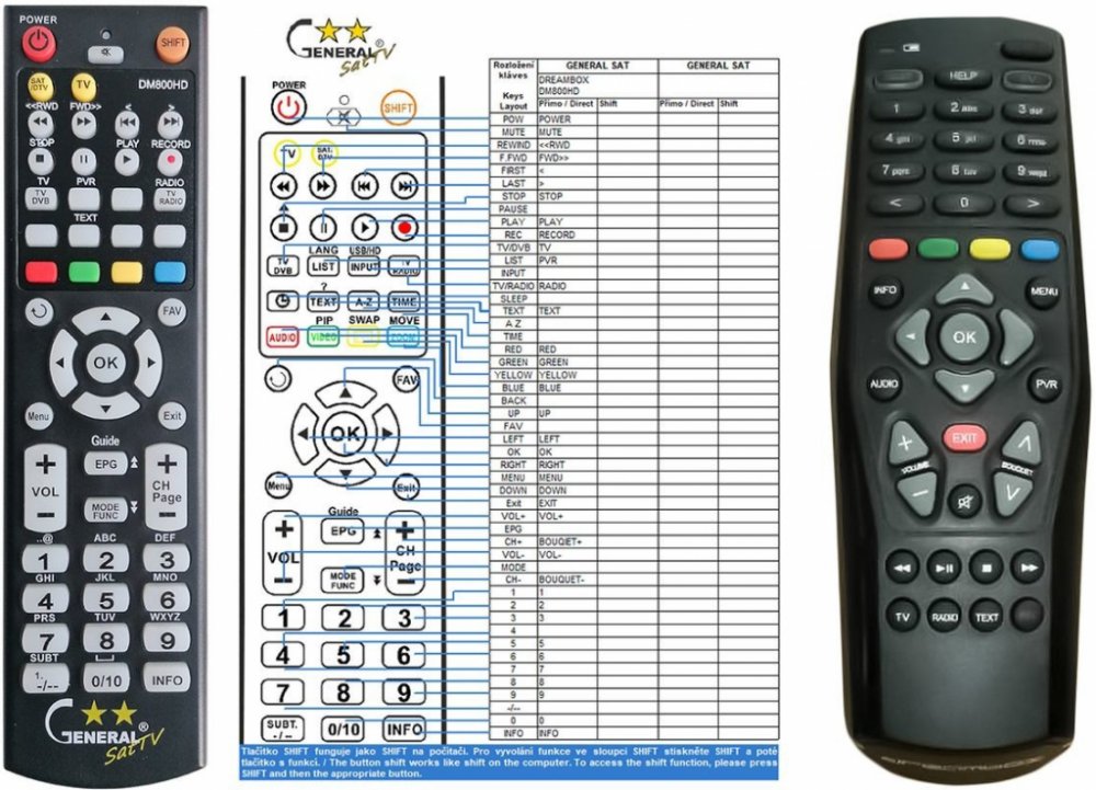 Náhradní dálkový ovladač DREAMBOX RC10. Je plně kompatibilní s následujícími modely značky DREAMBOX:DM500 HD V2, DM500-HD V2, DM525, DM7020 HD V2, DM7020-HD-V2, DM800 HD SE V2, DM800-HD-SE-V2. (Nemusí zde být uvedeny úplně všechny kompatibilní modely. Pokud si nejste jisti, sdělte nám svůj model (použijte online chat, e-mail, telefon), neprodleně zkontrolujeme a ověříme, zda je tento ovladač kompatibilní s Vaším přístrojem. Za poskytnutou informaci ručíme.) Byl nahrazen kompatibilním dálkovým ovladačem DM500HD, DM800HD (zobrazen vlevo).Ovladač má, stejně jako původní originál, doplňkovou funkci ovládání televizoru. Můžete ovládat Dreambox a televizor jedním ovladačem! Návod k nastavení je přiložen.Vysoká kvalita materiálu a zpracování, naprosto bezporuchový. Všechny naše dálkové ovladače kontrolujeme a testujeme, proto garantujeme jejich spolehlivost, nadstandartně dlouhý dosah signálu a výbornou citlivost tlačítek.Tento dálkový ovladač nemusíte nijak párovat, nevyžaduje žádné nastavování ani kódy. Stačí vložit baterie a funguje se všemi výše uvedenými modely.
