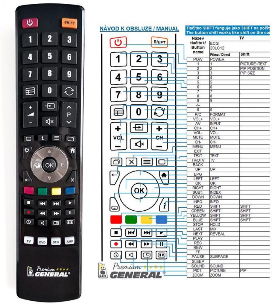 Náhradní dálkový ovladač ECG 20LC12 - 100% náhrada 1:1 za originální dálkový ovladač. Dálkový ovladač byl vyvinut speciálně na míru pro tyto modely značky ECG:20LC12. (Nemusí zde být uvedeny úplně všechny kompatibilní modely. Pokud si nejste jisti, sdělte nám svůj model (použijte online chat, e-mail, telefon), neprodleně zkontrolujeme a ověříme, zda je tento ovladač kompatibilní s Vaším přístrojem. Za poskytnutou informaci ručíme.) Ovladač je dodáván ve verzi značkového dálkového ovladače General Premium (zobrazen vlevo). Garantujeme Vám, že dostanete ovladač, který plně nahradí Váš původní originální ovladač a bude mít naprosto všechny funkce stejné.Není to univerzální ovladač, ale ovladač, který je naprogramován a přímo určen pro modely přístrojů uvedené výše. Není třeba žádné párování, žádné kódy. Obdržíte od nás ovladač, který je připraven k použití - jediné, co musíte udělat, je vložit baterie a ovladač hned funguje. Podívejte se na obrázek ovladače a ujistěte se, že jsou v tabulce všechny funkce jako na původním originálním ovladači. Jedná se o plnohodnotný náhradní dálkový ovladač (není to „univerzál“). Má naprosto všechny funkce přesně jako originální ovladač. Záruční lhůta na ovladač je 3 roky. Dodáván také jednoduchý návod s mapováním funkcí. DOPLŇKOVÁ FUNKCE: Tento dálkový ovladač je možno naprogramovat na 1-4 zařízení (celkem tedy 4). Budete moci jedním ovladačem ovládat několik různých přístrojů jedním ovladačem. Pokud nám do komentáře v objednávce napíšete modely dalších přístrojů, naprogramujeme Vám ovladač na všechny. Za tuto doplňkovou službu bude naúčtován příplatek k ceně ovladače 50 Kč: více informacíV případě, že v budoucnu vyměníte/obměníte Vaši domácí elektroniku, jsme schopni Vám tento ovladač přeprogramovat na naprosto jakékoliv nové/á zařízení. Ovladač General přežije Váš stávající přístroj!