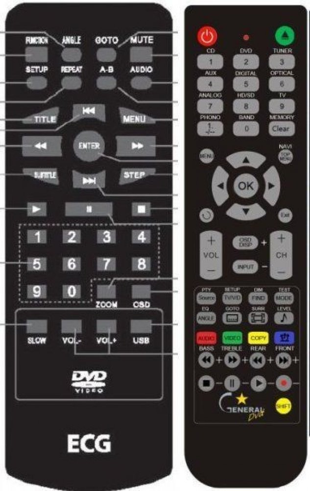Náhradní dálkový ovladač ECG DVP7709, DVP7708, DVP7407 - 100% náhrada 1:1 za originální dálkový ovladač. Dálkový ovladač byl vyvinut speciálně na míru pro tyto modely značky ECG:DVP7407, DVP7407PB, DVP7708, DVP7708PURPLE, DVP7708RED, DVP7708WHITE, DVP7709, DVP7709WHITE. (Nemusí zde být uvedeny úplně všechny kompatibilní modely. Pokud si nejste jisti, sdělte nám svůj model (použijte online chat, e-mail, telefon), neprodleně zkontrolujeme a ověříme, zda je tento ovladač kompatibilní s Vaším přístrojem. Za poskytnutou informaci ručíme.) Ovladač je dodáván ve verzi značkového dálkového ovladače General DVD/AUDIO (zobrazen vlevo). Garantujeme Vám, že dostanete ovladač, který plně nahradí Váš původní originální ovladač a bude mít naprosto všechny funkce stejné.Není to univerzální ovladač, ale ovladač, který je naprogramován a přímo určen pro modely přístrojů uvedené výše. Není třeba žádné párování, žádné kódy. Obdržíte od nás ovladač, který je připraven k použití - jediné, co musíte udělat, je vložit baterie a ovladač hned funguje. Podívejte se na obrázek ovladače a ujistěte se, že jsou v tabulce všechny funkce jako na původním originálním ovladači. Jedná se o plnohodnotný náhradní dálkový ovladač (není to „univerzál“). Má naprosto všechny funkce přesně jako originální ovladač. Záruční lhůta na ovladač je 3 roky. Dodáván také jednoduchý návod s mapováním funkcí. DOPLŇKOVÁ FUNKCE: Tento dálkový ovladač je možno naprogramovat na 1 další přístroj. Budete moci jedním ovladačem ovládat oba přístroje (např. DVD+TV nebo SOUNDBAR+TV apod.). Pokud nám do komentáře v objednávce napíšete model dalšího přístroje, naprogramujeme Vám ovladač na oba. Za tuto doplňkovou službu bude naúčtován příplatek k ceně ovladače 50 Kč: více informací