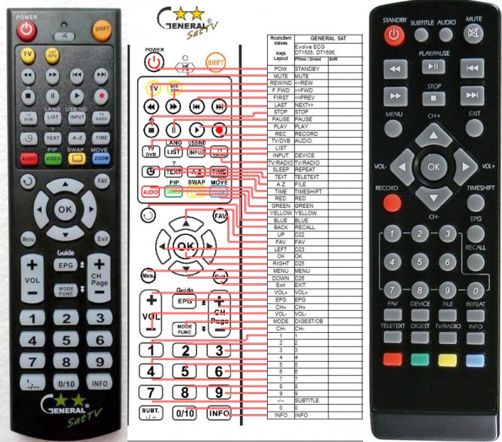 Náhradní dálkový ovladač ECG DVT950PVR - 100% náhrada 1:1 za originální dálkový ovladač. Dálkový ovladač byl vyvinut speciálně na míru pro tyto modely značky ECG:DVT 950 PVR, DVT950PVR. (Nemusí zde být uvedeny úplně všechny kompatibilní modely. Pokud si nejste jisti, sdělte nám svůj model (použijte online chat, e-mail, telefon), neprodleně zkontrolujeme a ověříme, zda je tento ovladač kompatibilní s Vaším přístrojem. Za poskytnutou informaci ručíme.) Ovladač je dodáván ve verzi značkového dálkového ovladače General SAT/TV (zobrazen vlevo). Garantujeme Vám, že dostanete ovladač, který plně nahradí Váš původní originální ovladač a bude mít naprosto všechny funkce stejné.Není to univerzální ovladač, ale ovladač, který je naprogramován a přímo určen pro modely přístrojů uvedené výše. Není třeba žádné párování, žádné kódy. Obdržíte od nás ovladač, který je připraven k použití - jediné, co musíte udělat, je vložit baterie a ovladač hned funguje. Podívejte se na obrázek ovladače a ujistěte se, že jsou v tabulce všechny funkce jako na původním originálním ovladači. Jedná se o plnohodnotný náhradní dálkový ovladač (není to „univerzál“). Má naprosto všechny funkce přesně jako originální ovladač. Záruční lhůta na ovladač je 3 roky. Dodáván také jednoduchý návod s mapováním funkcí. DOPLŇKOVÁ FUNKCE: Tento dálkový ovladač je možno naprogramovat na 1 další přístroj. Budete moci jedním ovladačem ovládat oba přístroje (např. SAT+TV nebo SAT+DVD apod). Pokud nám do komentáře v objednávce napíšete model dalšího přístroje, naprogramujeme Vám ovladač na oba. Za tuto doplňkovou službu bude naúčtován příplatek k ceně ovladače 50 Kč: více informací