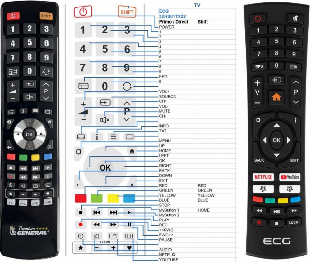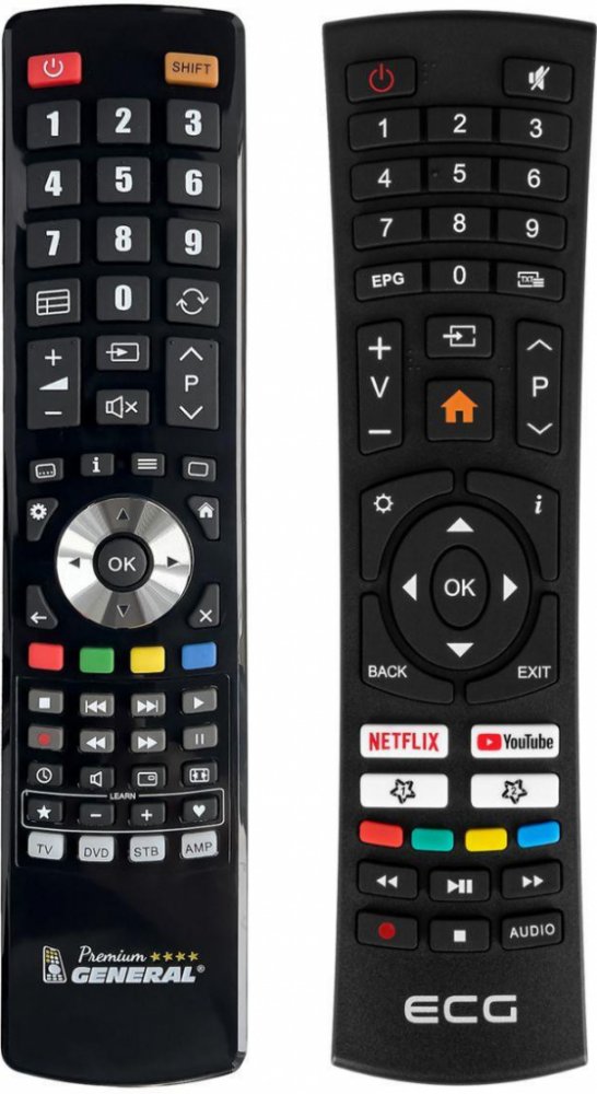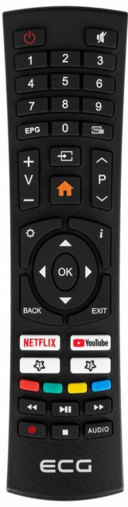 Náhradní dálkový ovladač ECG HS01T2S2, FS01T2S2, US01T2S2 - 100procent náhrada 1:1 za originální dálkový ovladač. Dálkový ovladač je určen pro tyto modely ECG: 24HS01T2S2, 32HS01T2S2, 40FS01T2S2, 43US01T2S2, 50US01T2S2. (Nemusí zde být uvedeny úplně všechny kompatibilní modely. Pokud si nejste jisti, sdělte nám svůj model (použijte online chat, e-mail, telefon), neprodleně zkontrolujeme a ověříme, zda je tento ovladač kompatibilní s Vaším přístrojem. Za poskytnutou informaci ručíme.) Ovladač je dodáván ve verzi značkového dálkového ovladače General Premium (zobrazen vlevo). Garantujeme Vám, že dostanete ovladač, který plně nahradí Váš původní originální ovladač a bude mít naprosto všechny funkce. Není to univerzální ovladač, ale ovladač, který je naprogramován a přímo určen pro modely přístrojů uvedené výše. Není třeba žádné párování, žádné kódy. Obdržíte od nás ovladač, který je připraven k použití - jediné, co musíte udělat, je vložit baterie a ovladač hned funguje. Podívejte se na obrázek ovladače a ujistěte se, že jsou v tabulce všechny funkce jako na původním originálním ovladači. Jedná se o plnohodnotný náhradní dálkový ovladač (není to „univerzál“). Má naprosto všechny funkce přesně jako originální ovladač. Záruční lhůta na ovladač je 2 roky. Dodáván také jednoduchý návod s mapováním funkcí. DOPLŇKOVÁ FUNKCE: Tento dálkový ovladač je možno naprogramovat na 1-4 zařízení (celkem tedy 4). Budete moci jedním ovladačem ovládat několik různých přístrojů jedním ovladačem. Pokud nám do komentáře v objednávce napíšete modely dalších přístrojů, naprogramujeme Vám ovladač na všechny. Za tuto doplňkovou službu bude naúčtován příplatek k ceně ovladače 50 Kč: více informací V případě, že v budoucnu vyměníte/obměníte Vaši domácí elektroniku, jsme schopni Vám tento ovladač přeprogramovat na naprosto jakékoliv nové/á zařízení. Ovladač General přežije Váš stávající přístroj!