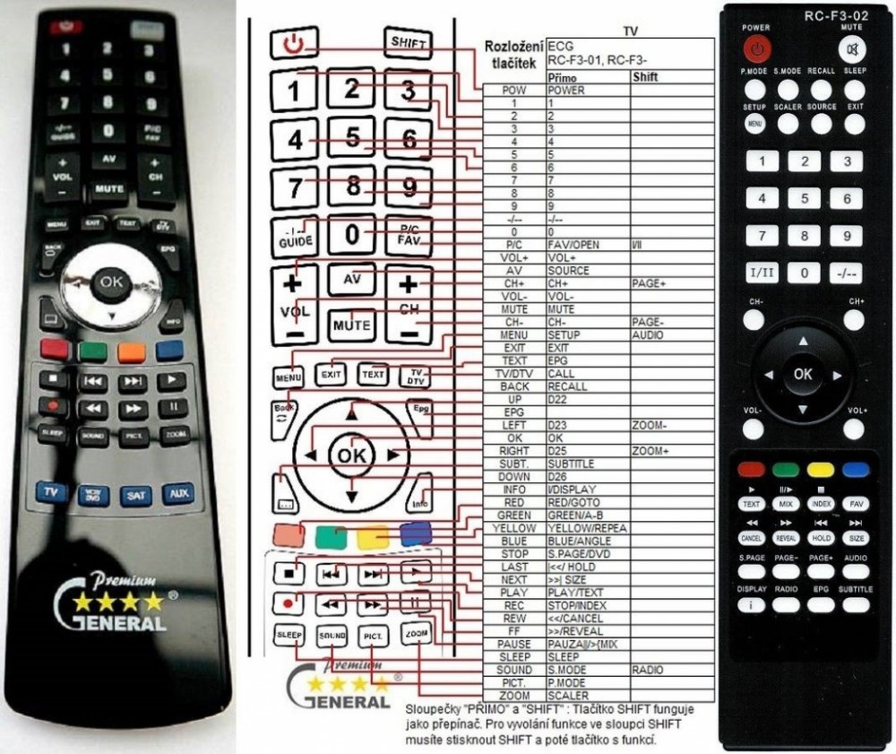 Náhradní dálkový ovladač ECG RC-F3-02 (RCF302) - 100procent náhrada 1:1 za originální dálkový ovladač. Dálkový ovladač je určen pro tyto modely ECG: 32LHD171PVR. (Nemusí zde být uvedeny úplně všechny kompatibilní modely. Pokud si nejste jisti, sdělte nám svůj model (použijte online chat, e-mail, telefon), neprodleně zkontrolujeme a ověříme, zda je tento ovladač kompatibilní s Vaším přístrojem. Za poskytnutou informaci ručíme.) Ovladač je dodáván ve verzi značkového dálkového ovladače General Premium (zobrazen vlevo). Garantujeme Vám, že dostanete ovladač, který plně nahradí Váš původní originální ovladač a bude mít naprosto všechny funkce. Není to univerzální ovladač, ale ovladač, který je naprogramován a přímo určen pro modely přístrojů uvedené výše. Není třeba žádné párování, žádné kódy. Obdržíte od nás ovladač, který je připraven k použití - jediné, co musíte udělat, je vložit baterie a ovladač hned funguje. Podívejte se na obrázek ovladače a ujistěte se, že jsou v tabulce všechny funkce jako na původním originálním ovladači. Jedná se o plnohodnotný náhradní dálkový ovladač (není to „univerzál“). Má naprosto všechny funkce přesně jako originální ovladač. Záruční lhůta na ovladač je 2 roky. Dodáván také jednoduchý návod s mapováním funkcí. DOPLŇKOVÁ FUNKCE: Tento dálkový ovladač je možno naprogramovat na 1-4 zařízení (celkem tedy 4). Budete moci jedním ovladačem ovládat několik různých přístrojů jedním ovladačem. Pokud nám do komentáře v objednávce napíšete modely dalších přístrojů, naprogramujeme Vám ovladač na všechny. Za tuto doplňkovou službu bude naúčtován příplatek k ceně ovladače 50 Kč: více informací V případě, že v budoucnu vyměníte/obměníte Vaši domácí elektroniku, jsme schopni Vám tento ovladač přeprogramovat na naprosto jakékoliv nové/á zařízení. Ovladač General přežije Váš stávající přístroj!