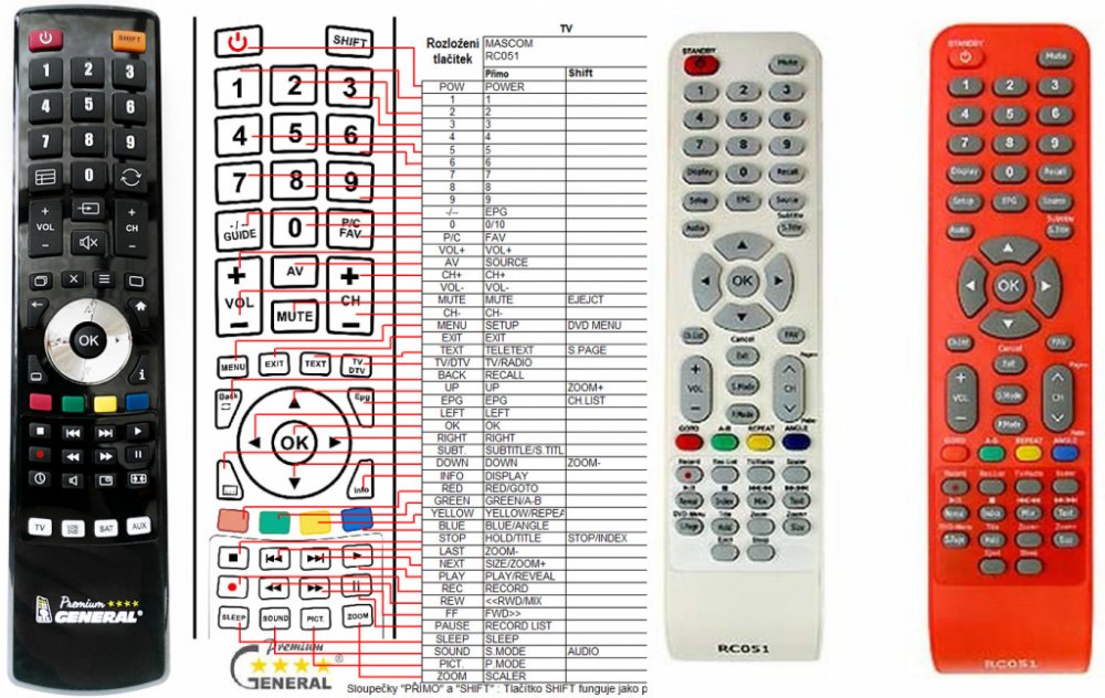 Náhradní dálkový ovladač ECG RC051 - 100% náhrada 1:1 za originální dálkový ovladač. Dálkový ovladač je určen pro tyto modely ECG:19LED200PVR, 24LED412PVR RED, 24LED412PVR WHITE. (Nemusí zde být uvedeny úplně všechny kompatibilní modely. Pokud si nejste jisti, sdělte nám svůj model (použijte online chat, e-mail, telefon), neprodleně zkontrolujeme a ověříme, zda je tento ovladač kompatibilní s Vaším přístrojem. Za poskytnutou informaci ručíme.) Ovladač je dodáván ve verzi značkového dálkového ovladače General Premium (zobrazen vlevo). Garantujeme Vám, že dostanete ovladač, který plně nahradí Váš původní originální ovladač a bude mít naprosto všechny funkce stejné.Není to univerzální ovladač, ale ovladač, který je naprogramován a přímo určen pro modely přístrojů uvedené výše. Není třeba žádné párování, žádné kódy. Obdržíte od nás ovladač, který je připraven k použití - jediné, co musíte udělat, je vložit baterie a ovladač hned funguje. Podívejte se na obrázek ovladače a ujistěte se, že jsou v tabulce všechny funkce jako na původním originálním ovladači. Jedná se o plnohodnotný náhradní dálkový ovladač (není to „univerzál“). Má naprosto všechny funkce přesně jako originální ovladač. Záruční lhůta na ovladač je 3 roky. Dodáván také jednoduchý návod s mapováním funkcí. DOPLŇKOVÁ FUNKCE: Tento dálkový ovladač je možno naprogramovat na 1-4 zařízení (celkem tedy 4). Budete moci jedním ovladačem ovládat několik různých přístrojů jedním ovladačem. Pokud nám do komentáře v objednávce napíšete modely dalších přístrojů, naprogramujeme Vám ovladač na všechny. Za tuto doplňkovou službu bude naúčtován příplatek k ceně ovladače 50 Kč: více informacíV případě, že v budoucnu vyměníte/obměníte Vaši domácí elektroniku, jsme schopni Vám tento ovladač přeprogramovat na naprosto jakékoliv nové/á zařízení. Ovladač General přežije Váš stávající přístroj!