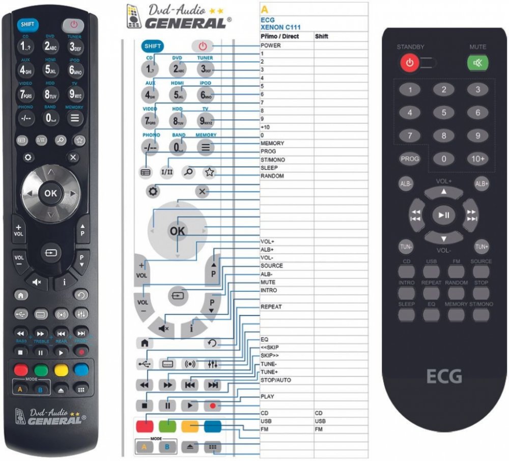 Náhradní dálkový ovladač ECG Xenon C 111 - 100% náhrada 1:1 za originální dálkový ovladač. Dokonalá 1:1 kopie navržená a vyrobená naší firmou – má všechny funkce originálního ovladače pro tyto modely značky ECG:XENON C111, XENON-C-111. (Nemusí zde být uvedeny úplně všechny kompatibilní modely. Pokud si nejste jisti, sdělte nám svůj model (použijte online chat, e-mail, telefon), neprodleně zkontrolujeme a ověříme, zda je tento ovladač kompatibilní s Vaším přístrojem. Za poskytnutou informaci ručíme.) Ovladač je dodáván ve verzi značkového dálkového ovladače General DVD/AUDIO (zobrazen vlevo). Garantujeme Vám, že dostanete ovladač, který plně nahradí Váš původní originální ovladač a bude mít naprosto všechny funkce stejné.Není to univerzální ovladač, ale ovladač, který je naprogramován a přímo určen pro modely přístrojů uvedené výše. Není třeba žádné párování, žádné kódy. Obdržíte od nás ovladač, který je připraven k použití - jediné, co musíte udělat, je vložit baterie a ovladač hned funguje. Podívejte se na obrázek ovladače a ujistěte se, že jsou v tabulce všechny funkce jako na původním originálním ovladači. Jedná se o plnohodnotný náhradní dálkový ovladač (není to „univerzál“). Má naprosto všechny funkce přesně jako originální ovladač. Záruční lhůta na ovladač je 3 roky. Dodáván také jednoduchý návod s mapováním funkcí. DOPLŇKOVÁ FUNKCE: Tento dálkový ovladač je možno naprogramovat na 1 další přístroj. Budete moci jedním ovladačem ovládat oba přístroje (např. DVD+TV nebo SOUNDBAR+TV apod.). Pokud nám do komentáře v objednávce napíšete model dalšího přístroje, naprogramujeme Vám ovladač na oba. Za tuto doplňkovou službu bude naúčtován příplatek k ceně ovladače 50 Kč: více informací