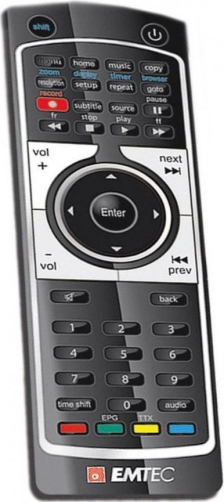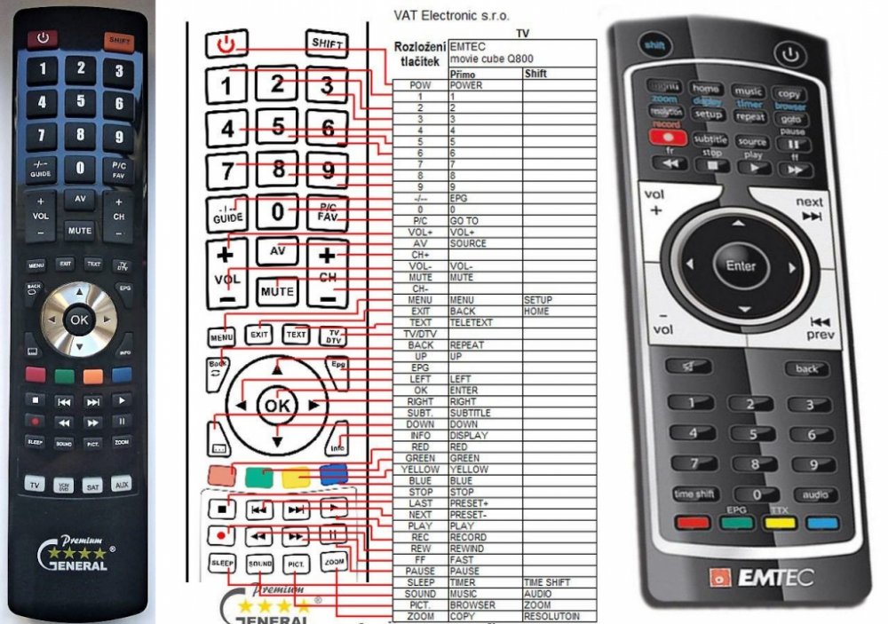 Náhradní dálkový ovladač EMTEC MOVIE CUBE Q800, S120H - 100% náhrada 1:1 za originální dálkový ovladač. Dálkový ovladač je určen pro tyto modely EMTEC:MOVIE CUBE S800, Q800, S120H. (Nemusí zde být uvedeny úplně všechny kompatibilní modely. Pokud si nejste jisti, sdělte nám svůj model (použijte online chat, e-mail, telefon), neprodleně zkontrolujeme a ověříme, zda je tento ovladač kompatibilní s Vaším přístrojem. Za poskytnutou informaci ručíme.) Ovladač je dodáván ve verzi značkového dálkového ovladače General Premium (zobrazen vlevo). Garantujeme Vám, že dostanete ovladač, který plně nahradí Váš původní originální ovladač a bude mít naprosto všechny funkce stejné.Není to univerzální ovladač, ale ovladač, který je naprogramován a přímo určen pro modely přístrojů uvedené výše. Není třeba žádné párování, žádné kódy. Obdržíte od nás ovladač, který je připraven k použití - jediné, co musíte udělat, je vložit baterie a ovladač hned funguje. Podívejte se na obrázek ovladače a ujistěte se, že jsou v tabulce všechny funkce jako na původním originálním ovladači. Jedná se o plnohodnotný náhradní dálkový ovladač (není to „univerzál“). Má naprosto všechny funkce přesně jako originální ovladač. Záruční lhůta na ovladač je 3 roky. Dodáván také jednoduchý návod s mapováním funkcí. DOPLŇKOVÁ FUNKCE: Tento dálkový ovladač je možno naprogramovat na 1-4 zařízení (celkem tedy 4). Budete moci jedním ovladačem ovládat několik různých přístrojů jedním ovladačem. Pokud nám do komentáře v objednávce napíšete modely dalších přístrojů, naprogramujeme Vám ovladač na všechny. Za tuto doplňkovou službu bude naúčtován příplatek k ceně ovladače 50 Kč: více informacíV případě, že v budoucnu vyměníte/obměníte Vaši domácí elektroniku, jsme schopni Vám tento ovladač přeprogramovat na naprosto jakékoliv nové/á zařízení. Ovladač General přežije Váš stávající přístroj!