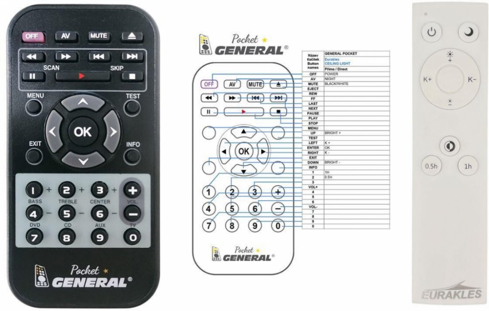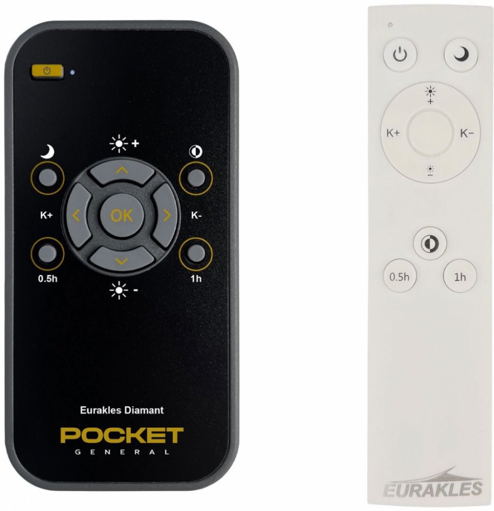 Dálkový ovladač EURAKLES Plafoniera DIAMANT STAR LED duplikát 1:1 originálního dálkového ovladače. Dálkový ovladač General POCKET duplikát má naprosto všechny funkce a popisky tlačítek stejné jako originální dálkový ovladač. Není třeba nic nastavovat, žádné kódy, funguje ihned po vložení baterií se všemi výše uvedenými modely.Ovladač je dodáván ve verzi značkového dálkového ovladače General POCKET