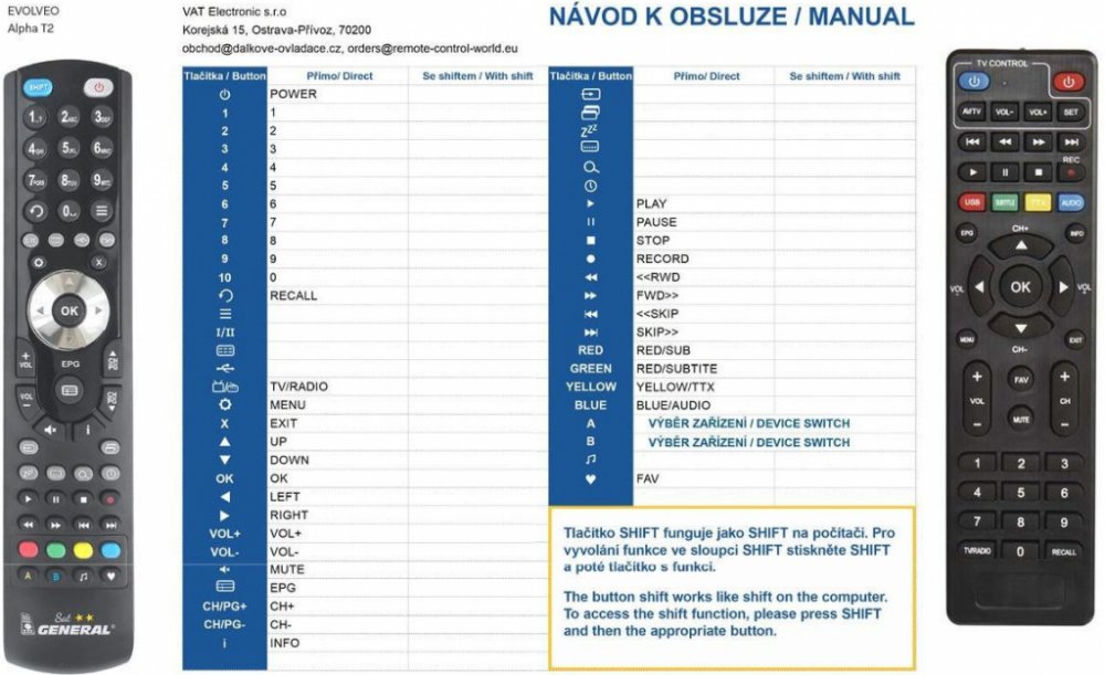 Náhradní dálkový ovladač EVOLVEO Alpha T2, Omega II T2 - 100% náhrada 1:1 za originální dálkový ovladač. Dálkový ovladač je určen pro tyto modely EVOLVEO:ALPHA T2, ALPHAT2, OMEGA I2T2. (Nemusí zde být uvedeny úplně všechny kompatibilní modely. Pokud si nejste jisti, sdělte nám svůj model (použijte online chat, e-mail, telefon), neprodleně zkontrolujeme a ověříme, zda je tento ovladač kompatibilní s Vaším přístrojem. Za poskytnutou informaci ručíme.) Ovladač je dodáván ve verzi značkového dálkového ovladače General SAT/TV (zobrazen vlevo). Garantujeme Vám, že dostanete ovladač, který plně nahradí Váš původní originální ovladač a bude mít naprosto všechny funkce stejné.Není to univerzální ovladač, ale ovladač, který je naprogramován a přímo určen pro modely přístrojů uvedené výše. Není třeba žádné párování, žádné kódy. Obdržíte od nás ovladač, který je připraven k použití - jediné, co musíte udělat, je vložit baterie a ovladač hned funguje. Podívejte se na obrázek ovladače a ujistěte se, že jsou v tabulce všechny funkce jako na původním originálním ovladači. Jedná se o plnohodnotný náhradní dálkový ovladač (není to „univerzál“). Má naprosto všechny funkce přesně jako originální ovladač. Záruční lhůta na ovladač je 3 roky. Dodáván také jednoduchý návod s mapováním funkcí. DOPLŇKOVÁ FUNKCE: Tento dálkový ovladač je možno naprogramovat na 1 další přístroj. Budete moci jedním ovladačem ovládat oba přístroje (např. SAT+TV nebo SAT+DVD apod). Pokud nám do komentáře v objednávce napíšete model dalšího přístroje, naprogramujeme Vám ovladač na oba. Za tuto doplňkovou službu bude naúčtován příplatek k ceně ovladače 50 Kč: více informací