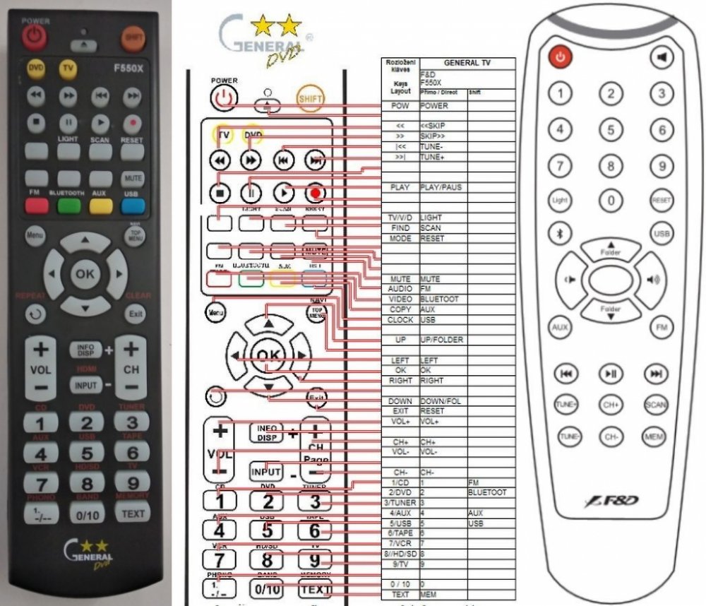 Dálkový ovladač F&D F550X duplikát 1:1 originálního dálkového ovladače. Dálkový ovladač je určen pro tyto modely F&D:A111X, A180X, F380X, F550X, F580X, FD-SPK016. (Nemusí zde být uvedeny úplně všechny kompatibilní modely. Pokud si nejste jisti, sdělte nám svůj model (použijte online chat, e-mail, telefon), neprodleně zkontrolujeme a ověříme, zda je tento ovladač kompatibilní s Vaším přístrojem. Za poskytnutou informaci ručíme.) Dálkový ovladač General DVD duplikát má naprosto všechny funkce a popisky tlačítek stejné jako originální dálkový ovladač. Není třeba nic nastavovat, žádné kódy, funguje ihned po vložení baterií se všemi výše uvedenými modely.Ovladač je dodáván ve verzi značkového dálkového ovladače General DVD duplikát (zobrazen vlevo) Jedná se o ovladač vyrobený pro specifické zařízení – NENÍ to univerzální ovladač! Má naprosto všechny funkce jako originální dálkový ovladač. Má stejné popisky tlačítek, jako jste byli zvyklí z originálu. Popisky tlačítek jsou velmi odolné a nejdou seškrábat ani hrubou silou. 3 roky záruka.General DVD duplikát byl navržen a vyroben přesně podle originálního dálkového ovladače tlačítko po tlačítku. Ovladač je vyvinut a testován v České republice a podléhá CE a ROHS standardům. SNADNÉ INTUITIVNÍ POUŽÍVÁNÍ: Na rozdíl od běžných náhradních ovladačů, General DVD duplikát má 100% odpovídající popisky tlačítek jako na originálním ovladači. Srovnání: Jiné univerzální nebo programovatelné náhrady mají kvůli snížení nákladů názvy/popisky a rozložení tlačítek univerzální, popisky tlačítek často neodpovídají funkci tlačítka a vyžadují tedy návody k použití. To často vede k nejasnostem, co které tlačítko dělá a stálá potřeba manuálu je velmi obtěžující. S ovladačem General DVD duplikát žádný návod nepotřebujete, tlačítko dělá přesně to, co symbolizuje jeho popisek.GARANTUJEME 100% FUNKČNOST: Narozdíl od jiných náhrad je každý dálkový ovladač General DVD duplikát přímo v naší firmě navržen a testován na míru pro konkrétní zařízení tak, aby každ..