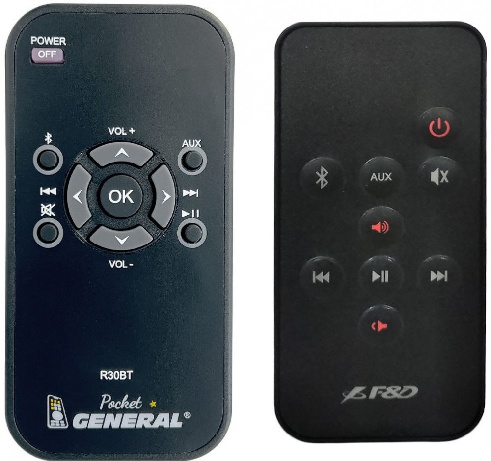 Dálkový ovladač F&D R30BT duplikát 1:1 originálního dálkového ovladače. Dálkový ovladač je určen pro tyto modely F&D:R-30BT, R30BT. (Nemusí zde být uvedeny úplně všechny kompatibilní modely. Pokud si nejste jisti, sdělte nám svůj model (použijte online chat, e-mail, telefon), neprodleně zkontrolujeme a ověříme, zda je tento ovladač kompatibilní s Vaším přístrojem. Za poskytnutou informaci ručíme.) Dálkový ovladač General POCKET duplikát má naprosto všechny funkce a popisky tlačítek stejné jako originální dálkový ovladač. Není třeba nic nastavovat, žádné kódy, funguje ihned po vložení baterií se všemi výše uvedenými modely.Ovladač je dodáván ve verzi značkového dálkového ovladače General POCKET duplikát (zobrazen vlevo) Jedná se o ovladač vyrobený pro specifické zařízení – NENÍ to univerzální ovladač! Má naprosto všechny funkce jako originální dálkový ovladač. Má stejné popisky tlačítek, jako jste byli zvyklí z originálu. Popisky tlačítek jsou velmi odolné a nejdou seškrábat ani hrubou silou. 3 roky záruka.General POCKET duplikát byl navržen a vyroben přesně podle originálního dálkového ovladače tlačítko po tlačítku. Ovladač je vyvinut a testován v České republice a podléhá CE a ROHS standardům. SNADNÉ INTUITIVNÍ POUŽÍVÁNÍ: Na rozdíl od běžných náhradních ovladačů, General POCKET duplikát má 100% odpovídající popisky tlačítek jako na originálním ovladači. Srovnání: Jiné univerzální nebo programovatelné náhrady mají kvůli snížení nákladů názvy/popisky a rozložení tlačítek univerzální, popisky tlačítek často neodpovídají funkci tlačítka a vyžadují tedy návody k použití. To často vede k nejasnostem, co které tlačítko dělá a stálá potřeba manuálu je velmi obtěžující. S ovladačem General POCKET duplikát žádný návod nepotřebujete, tlačítko dělá přesně to, co symbolizuje jeho popisek.GARANTUJEME 100% FUNKČNOST: Narozdíl od jiných náhrad je každý dálkový ovladač General POCKET duplikát přímo v naší firmě navržen a testován na míru pro konkrétní zařízení tak, aby každé tlačítko od..