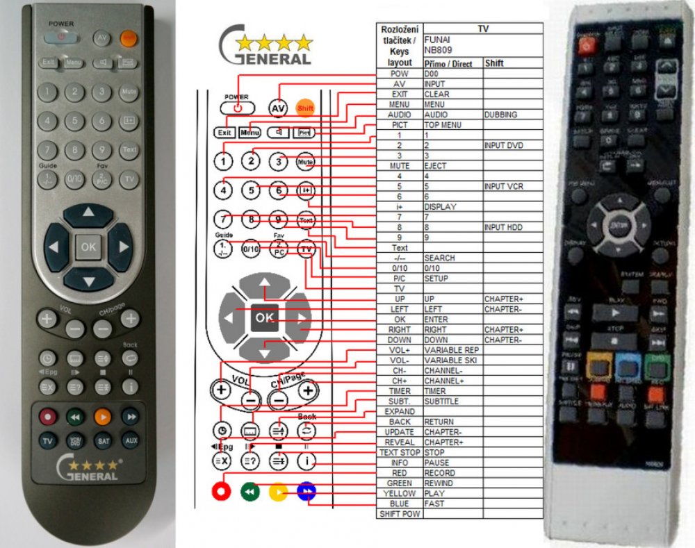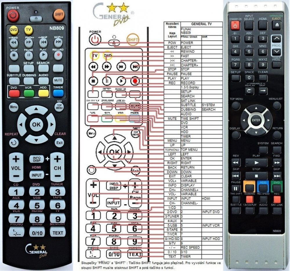 Dálkový ovladač FUNAI NB809 duplikát 1:1 originálního dálkového ovladače. Dálkový ovladač byl vyvinut speciálně na míru pro tyto modely značky FUNAI:T5D-D8482DB, T5DD8482DB, TD6D-D500GB. (Nemusí zde být uvedeny úplně všechny kompatibilní modely. Pokud si nejste jisti, sdělte nám svůj model (použijte online chat, e-mail, telefon), neprodleně zkontrolujeme a ověříme, zda je tento ovladač kompatibilní s Vaším přístrojem. Za poskytnutou informaci ručíme.) Dálkový ovladač General DVD duplikát má naprosto všechny funkce a popisky tlačítek stejné jako originální dálkový ovladač. Není třeba nic nastavovat, žádné kódy, funguje ihned po vložení baterií se všemi výše uvedenými modely.Ovladač je dodáván ve verzi značkového dálkového ovladače General DVD duplikát (zobrazen vlevo) Jedná se o ovladač vyrobený pro specifické zařízení – NENÍ to univerzální ovladač! Má naprosto všechny funkce jako originální dálkový ovladač. Má stejné popisky tlačítek, jako jste byli zvyklí z originálu. Popisky tlačítek jsou velmi odolné a nejdou seškrábat ani hrubou silou. 3 roky záruka.General DVD duplikát byl navržen a vyroben přesně podle originálního dálkového ovladače tlačítko po tlačítku. Ovladač je vyvinut a testován v České republice a podléhá CE a ROHS standardům. SNADNÉ INTUITIVNÍ POUŽÍVÁNÍ: Na rozdíl od běžných náhradních ovladačů, General DVD duplikát má 100% odpovídající popisky tlačítek jako na originálním ovladači. Srovnání: Jiné univerzální nebo programovatelné náhrady mají kvůli snížení nákladů názvy/popisky a rozložení tlačítek univerzální, popisky tlačítek často neodpovídají funkci tlačítka a vyžadují tedy návody k použití. To často vede k nejasnostem, co které tlačítko dělá a stálá potřeba manuálu je velmi obtěžující. S ovladačem General DVD duplikát žádný návod nepotřebujete, tlačítko dělá přesně to, co symbolizuje jeho popisek.GARANTUJEME 100% FUNKČNOST: Narozdíl od jiných náhrad je každý dálkový ovladač General DVD duplikát přímo v naší firmě navržen a testován na míru pro konkrétn..