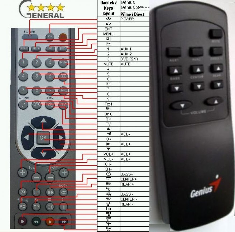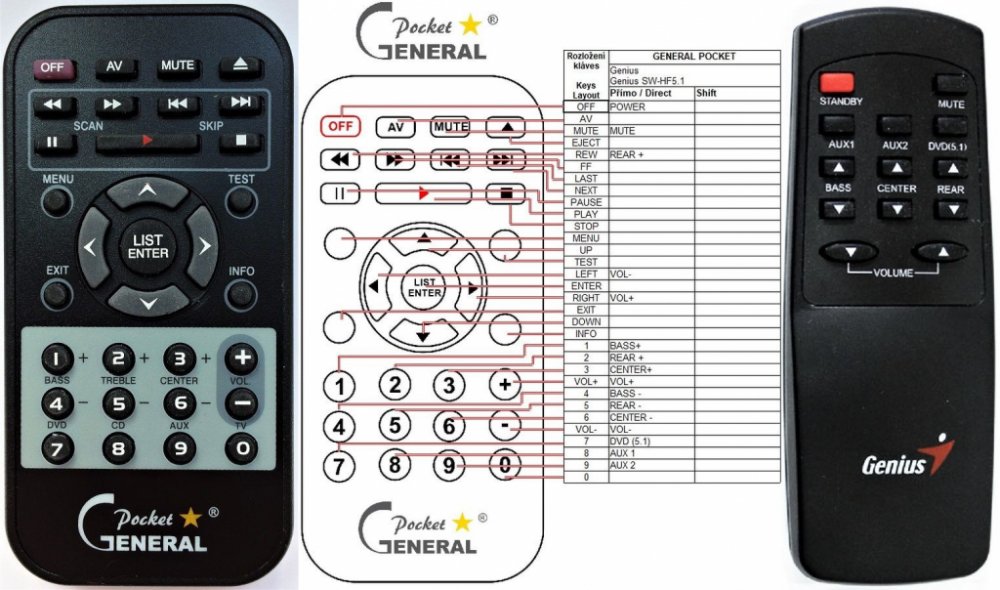 Náhradní dálkový ovladač GENIUS SW-HF5.1 4000 (SWHF5.1 4000) - 100% náhrada 1:1 za originální dálkový ovladač. Dálkový ovladač je určen pro tyto modely GENIUS:SW-HF 5.1 4000, SWHF5.1 4000, SWHF5.1 5100. (Nemusí zde být uvedeny úplně všechny kompatibilní modely. Pokud si nejste jisti, sdělte nám svůj model (použijte online chat, e-mail, telefon), neprodleně zkontrolujeme a ověříme, zda je tento ovladač kompatibilní s Vaším přístrojem. Za poskytnutou informaci ručíme.) Ovladač je dodáván ve verzi značkového dálkového ovladače General POCKET (zobrazen vlevo). Garantujeme Vám, že dostanete ovladač, který plně nahradí Váš původní originální ovladač a bude mít naprosto všechny funkce stejné.Není to univerzální ovladač, ale ovladač, který je naprogramován a přímo určen pro modely přístrojů uvedené výše. Není třeba žádné párování, žádné kódy. Obdržíte od nás ovladač, který je připraven k použití - jediné, co musíte udělat, je vložit baterie a ovladač hned funguje. Podívejte se na obrázek ovladače a ujistěte se, že jsou v tabulce všechny funkce jako na původním originálním ovladači. Jedná se o plnohodnotný náhradní dálkový ovladač (není to „univerzál“). Má naprosto všechny funkce přesně jako originální ovladač. Záruční lhůta na ovladač je 3 roky. Dodáván také jednoduchý návod s mapováním funkcí.