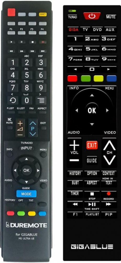 Dálkový ovladač GIGABLUE HD Ultra UE, UHD IP 4K duplikát 1:1 originálního dálkového ovladače. Dokonalá 1:1 kopie navržená a vyrobená naší firmou – má všechny funkce originálního ovladače pro tyto modely značky GIGABLUE:GIGABLUE HD ULTRA UE, GIGABLUE UHD TRIO 4K, UHD IP 4K. (Nemusí zde být uvedeny úplně všechny kompatibilní modely. Pokud si nejste jisti, sdělte nám svůj model (použijte online chat, e-mail, telefon), neprodleně zkontrolujeme a ověříme, zda je tento ovladač kompatibilní s Vaším přístrojem. Za poskytnutou informaci ručíme.) Dálkový ovladač General Duremote má naprosto všechny funkce a popisky tlačítek stejné jako originální dálkový ovladač. Není třeba nic nastavovat, žádné kódy, funguje ihned po vložení baterií se všemi výše uvedenými modely.Ovladač je dodáván ve verzi značkového dálkového ovladače General Duremote (zobrazen vlevo)Jedná se o ovladač vyrobený pro specifické zařízení – NENÍ to univerzální ovladač!Má naprosto všechny funkce jako originální dálkový ovladač.Má stejné popisky tlačítek, jako jste byli zvyklí z originálu.Popisky tlačítek jsou velmi odolné a nejdou seškrábat ani hrubou silou.3 roky záruka.Nulová poruchovost tohoto modelu! Nemáme zádné reklamace a přitom je to náš nejprodávanější ovladač.General Duremote byl tlačítko po tlačítku navržen a vyroben přesně podle originálního dálkového ovladače na obrázku vpravo. Výroben v naší firmě v Ostravě, vývoj, výroba i atesty v České republice - splňuje CE a ROHS standardy.SNADNÉ INTUITIVNÍ POUŽÍVÁNÍ: Na rozdíl od běžných náhradních ovladačů, General Duremote má 100% stejné popisky tlačítek jako Váš původní originální dálkový ovladač.Srovnání: Ostatní univerzální nebo programovatelné náhrady mají (kvůli úspoře nákladů) univerzální rozložení s nesprávně označenými tlačítky, a proto potřebují návod (tabulku funkcí), který říká, jaká je skutečná funkce jednotlivých tlačítek. To může způsobovat zmatek a nutnost neustálého vracení se k návodu je pro koncového uživatele obtěžující. Naopak při používání našeho dálkového ovlad..