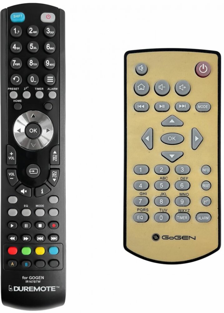 Dálkový ovladač GOGEN IR167BTW duplikát 1:1 originálního dálkového ovladače. Dálkový ovladač General Duremote má naprosto všechny funkce a popisky tlačítek stejné jako originální dálkový ovladač. Není třeba nic nastavovat, žádné kódy, funguje ihned po vložení baterií se všemi výše uvedenými modely.Ovladač je dodáván ve verzi značkového dálkového ovladače General Duremote (zobrazen vlevo) Jedná se
