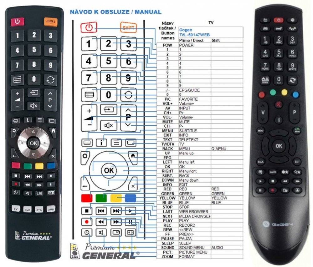 Náhradní dálkový ovladač GOGEN RC4900 - 100% náhrada 1:1 za originální dálkový ovladač. Dálkový ovladač je určen pro tyto modely GOGEN:TVF-32157WEB, TVF24257WEB , TVF32157WEB, TVF32257SWEB, TVF40248WEB, TVF40266, TVF40276WEB, TVF40384WEB, TVF40550WEBW, TVF48164, TVF48266, TVF48276WEB, TVH24151, TVH24266, TVH32266, TVH32357WEB, TVL-50147WEB, TVL22157WEB, TVL24137WEB, TVL32147WEB, TVL32227DLCRR, TVL39157WEB, TVL39167, TVL50147WEB, TVL50180WEB, WEBTVH24266 . (Nemusí zde být uvedeny úplně všechny kompatibilní modely. Pokud si nejste jisti, sdělte nám svůj model (použijte online chat, e-mail, telefon), neprodleně zkontrolujeme a ověříme, zda je tento ovladač kompatibilní s Vaším přístrojem. Za poskytnutou informaci ručíme.) Ovladač je dodáván ve verzi značkového dálkového ovladače General Premium (zobrazen vlevo). Garantujeme Vám, že dostanete ovladač, který plně nahradí Váš původní originální ovladač a bude mít naprosto všechny funkce stejné.Není to univerzální ovladač, ale ovladač, který je naprogramován a přímo určen pro modely přístrojů uvedené výše. Není třeba žádné párování, žádné kódy. Obdržíte od nás ovladač, který je připraven k použití - jediné, co musíte udělat, je vložit baterie a ovladač hned funguje. Podívejte se na obrázek ovladače a ujistěte se, že jsou v tabulce všechny funkce jako na původním originálním ovladači. Jedná se o plnohodnotný náhradní dálkový ovladač (není to „univerzál“). Má naprosto všechny funkce přesně jako originální ovladač. Záruční lhůta na ovladač je 3 roky. Dodáván také jednoduchý návod s mapováním funkcí. DOPLŇKOVÁ FUNKCE: Tento dálkový ovladač je možno naprogramovat na 1-4 zařízení (celkem tedy 4). Budete moci jedním ovladačem ovládat několik různých přístrojů jedním ovladačem. Pokud nám do komentáře v objednávce napíšete modely dalších přístrojů, naprogramujeme Vám ovladač na všechny. Za tuto doplňkovou službu bude naúčtován příplatek k ceně ovladače 50 Kč: více informacíV případě, že v budoucnu vyměníte/obměnít..