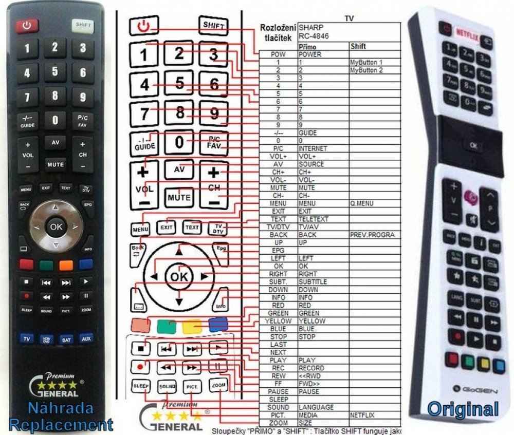 Náhradní dálkový ovladač GOGEN TVF40N550STWEBW - 100% náhrada 1:1 za originální dálkový ovladač. Dálkový ovladač byl vyvinut speciálně na míru pro tyto modely značky GOGEN:TVF40N550STWEBW. (Nemusí zde být uvedeny úplně všechny kompatibilní modely. Pokud si nejste jisti, sdělte nám svůj model (použijte online chat, e-mail, telefon), neprodleně zkontrolujeme a ověříme, zda je tento ovladač kompatibilní s Vaším přístrojem. Za poskytnutou informaci ručíme.) Ovladač je dodáván ve verzi značkového dálkového ovladače General Premium (zobrazen vlevo). Garantujeme Vám, že dostanete ovladač, který plně nahradí Váš původní originální ovladač a bude mít naprosto všechny funkce stejné.Není to univerzální ovladač, ale ovladač, který je naprogramován a přímo určen pro modely přístrojů uvedené výše. Není třeba žádné párování, žádné kódy. Obdržíte od nás ovladač, který je připraven k použití - jediné, co musíte udělat, je vložit baterie a ovladač hned funguje. Podívejte se na obrázek ovladače a ujistěte se, že jsou v tabulce všechny funkce jako na původním originálním ovladači. Jedná se o plnohodnotný náhradní dálkový ovladač (není to „univerzál“). Má naprosto všechny funkce přesně jako originální ovladač. Záruční lhůta na ovladač je 3 roky. Dodáván také jednoduchý návod s mapováním funkcí. DOPLŇKOVÁ FUNKCE: Tento dálkový ovladač je možno naprogramovat na 1-4 zařízení (celkem tedy 4). Budete moci jedním ovladačem ovládat několik různých přístrojů jedním ovladačem. Pokud nám do komentáře v objednávce napíšete modely dalších přístrojů, naprogramujeme Vám ovladač na všechny. Za tuto doplňkovou službu bude naúčtován příplatek k ceně ovladače 50 Kč: více informacíV případě, že v budoucnu vyměníte/obměníte Vaši domácí elektroniku, jsme schopni Vám tento ovladač přeprogramovat na naprosto jakékoliv nové/á zařízení. Ovladač General přežije Váš stávající přístroj!