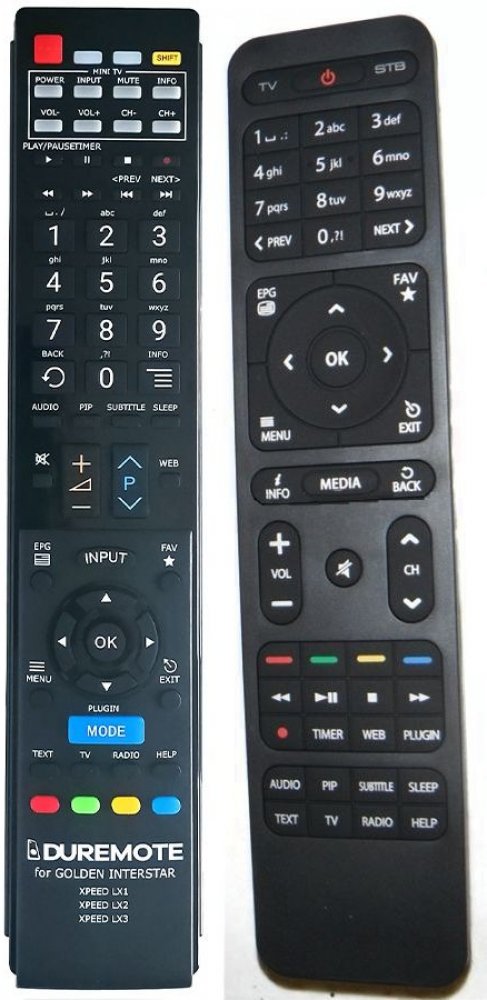 Dálkový ovladač GOLDEN INTERSTAR XPEED LX1, XPEED LX2, XPEED LX3 duplikát 1:1 originálního dálkového ovladače. Dálkový ovladač je určen pro tyto modely GOLDEN INTERSTAR:XPEED LX1, XPEED LX2, XPEED LX3. (Nemusí zde být uvedeny úplně všechny kompatibilní modely. Pokud si nejste jisti, sdělte nám svůj model (použijte online chat, e-mail, telefon), neprodleně zkontrolujeme a ověříme, zda je tento ovladač kompatibilní s Vaším přístrojem. Za poskytnutou informaci ručíme.) Dálkový ovladač General Duremote má naprosto všechny funkce a popisky tlačítek stejné jako originální dálkový ovladač. Není třeba nic nastavovat, žádné kódy, funguje ihned po vložení baterií se všemi výše uvedenými modely.Ovladač je dodáván ve verzi značkového dálkového ovladače General Duremote (zobrazen vlevo) Jedná se o ovladač vyrobený pro specifické zařízení – NENÍ to univerzální ovladač! Má naprosto všechny funkce jako originální dálkový ovladač. Má stejné popisky tlačítek, jako jste byli zvyklí z originálu. Popisky tlačítek jsou velmi odolné a nejdou seškrábat ani hrubou silou. 2 roky záruka.General Duremote byl navržen a vyroben přesně podle originálního dálkového ovladače tlačítko po tlačítku. Ovladač je vyvinut a testován v České republice a podléhá CE a ROHS standardům. SNADNÉ INTUITIVNÍ POUŽÍVÁNÍ: Na rozdíl od běžných náhradních ovladačů, General Duremote má 100% odpovídající popisky tlačítek jako na originálním ovladači. Srovnání: Jiné univerzální nebo programovatelné náhrady mají kvůli snížení nákladů názvy/popisky a rozložení tlačítek univerzální, popisky tlačítek často neodpovídají funkci tlačítka a vyžadují tedy návody k použití. To často vede k nejasnostem, co které tlačítko dělá a stálá potřeba manuálu je velmi obtěžující. S ovladačem General Duremote žádný návod nepotřebujete, tlačítko dělá přesně to, co symbolizuje jeho popisek.GARANTUJEME 100% FUNKČNOST: Narozdíl od jiných náhrad je každý dálkový ovladač General Duremote přímo v naší firmě navržen a testován na míru pro konkrétní zařízen..