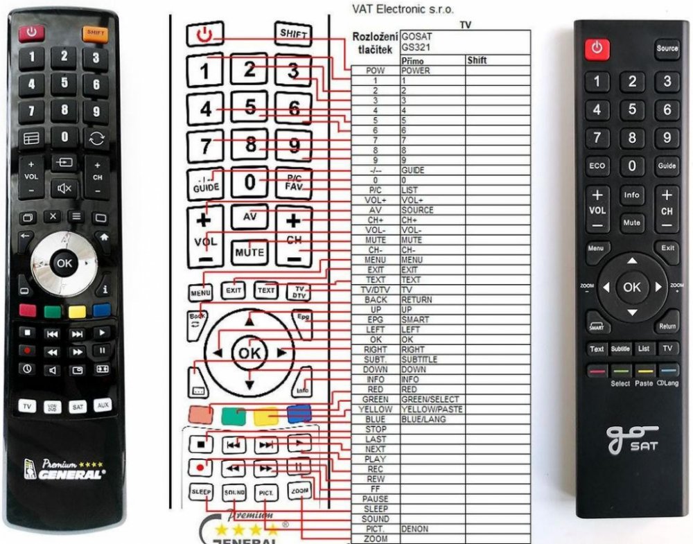 Náhradní dálkový ovladač GOSAT GS3210, GS3260, GS4360, GS5560 - 100% náhrada 1:1 za originální dálkový ovladač. Ovladač je dodáván ve verzi značkového dálkového ovladače General Premium (zobrazen vlevo). Garantujeme Vám, že dostanete ovladač, který plně nahradí Váš původní originální ovladač a bude mít naprosto všechny funkce stejné.Není to univerzální ovladač, ale ovladač, který je naprogramován